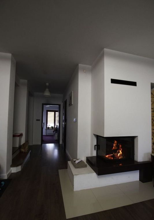 przestronny salon z nowoczesnym kominkiem