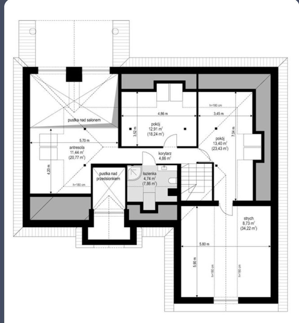 Dom oferuje funkcjonalny podział na strefy, zapewniający komfort codziennego życia i prywatność domowników.