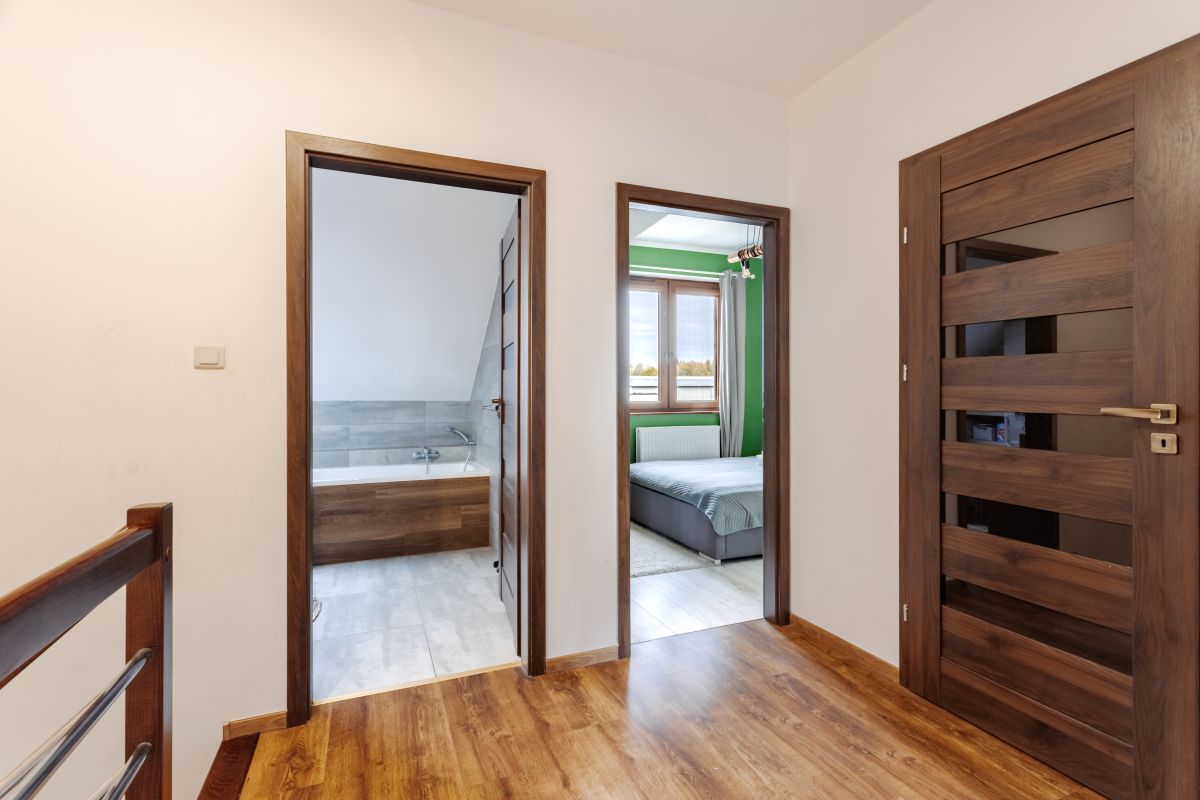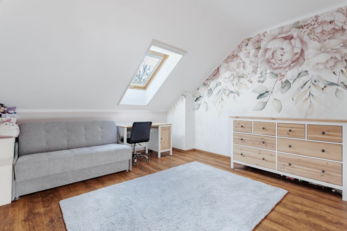 Dodatkowo wejście na strych o pow. 30 m2. Pomieszczenie jest wyposażone w zabudowę z półkami, które posłużą jako miejsce do przechowywania.