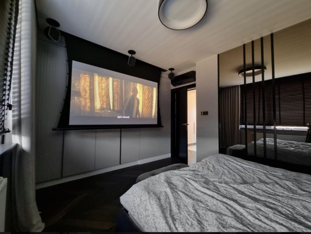 Kinowe udogodnienia: projektor z ekranem 90" w sypialni oraz telewizor 85" Samsunga w salonie.