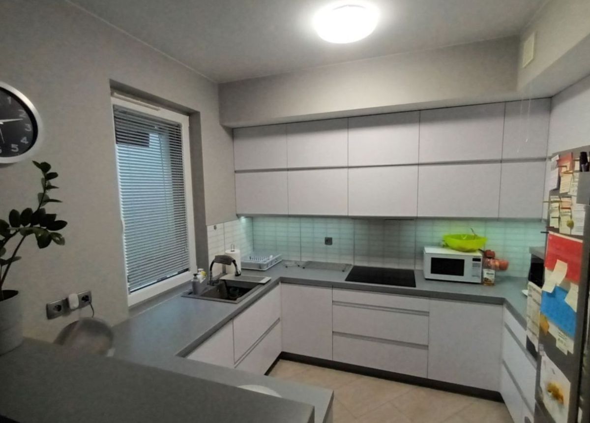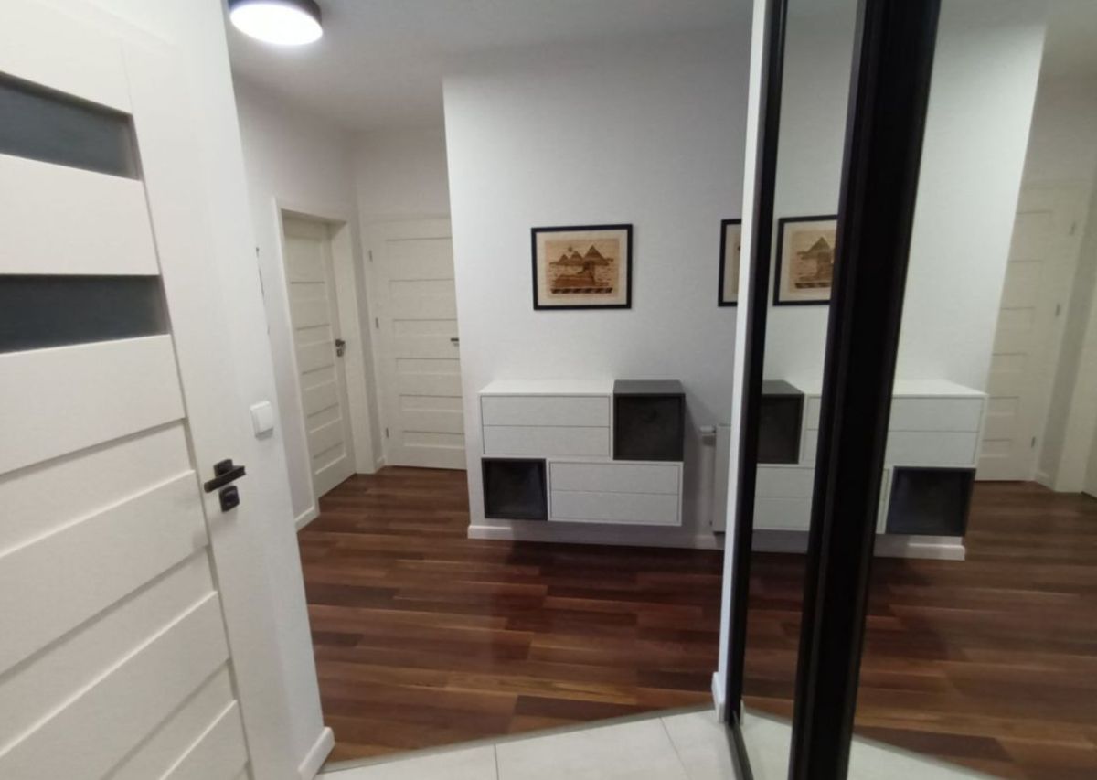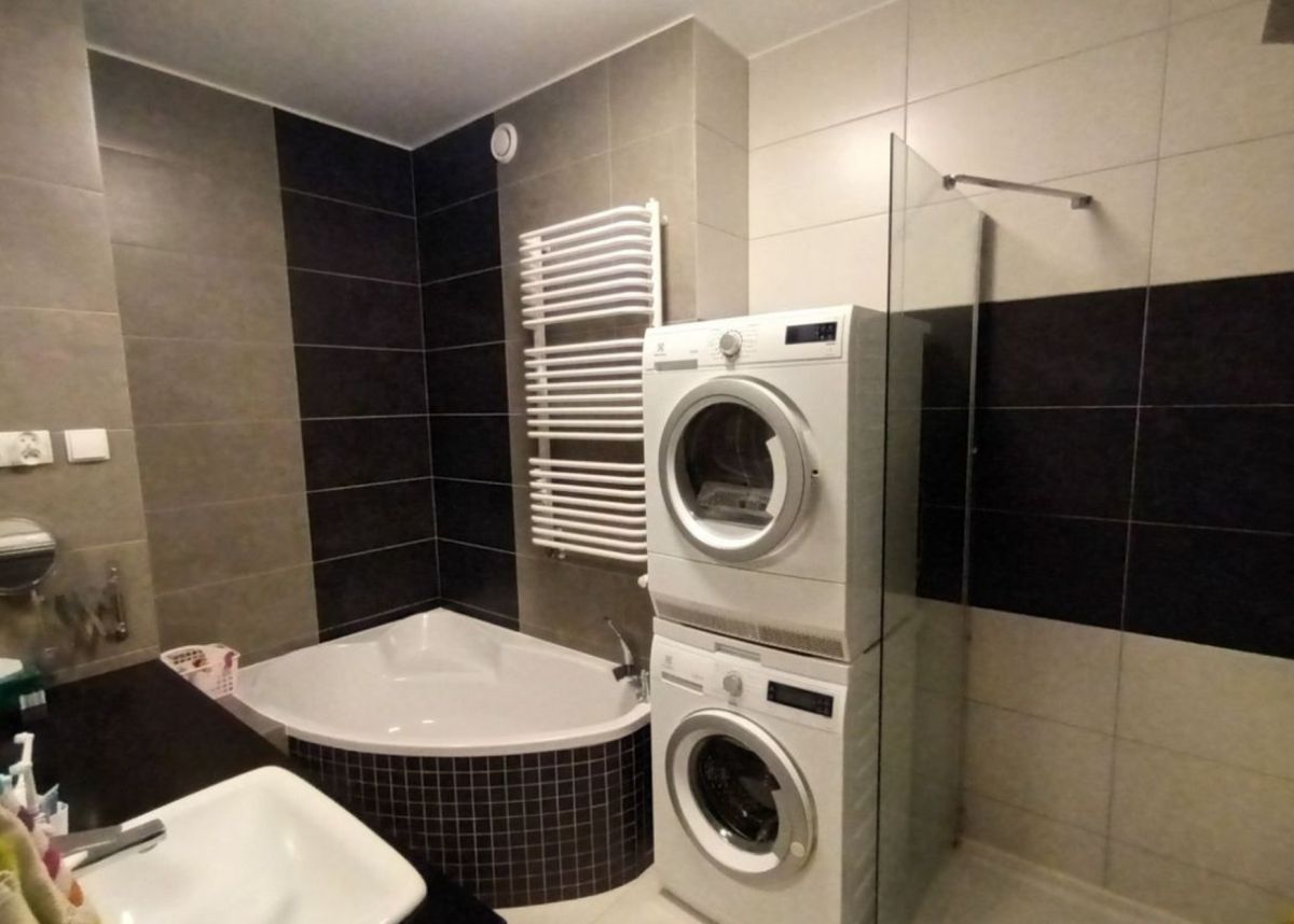 W cenie mieszkania uwzględniono również zabudowę kuchenną wykonaną na wymiar wraz ze sprzętem AGD, szafy wnękowe, meble łazienkowe, a także pralkę i suszarkę do ubrań.
