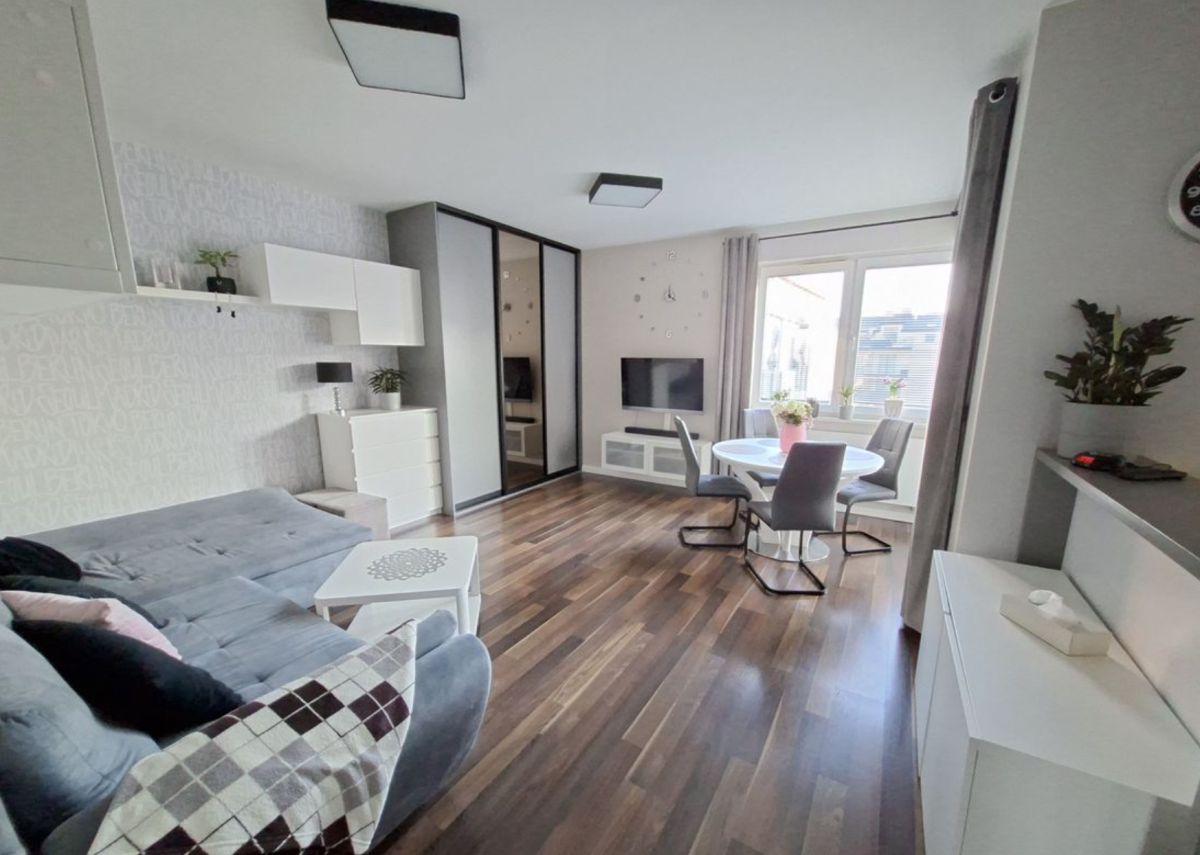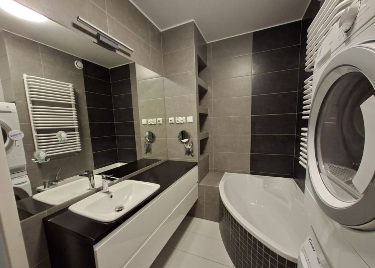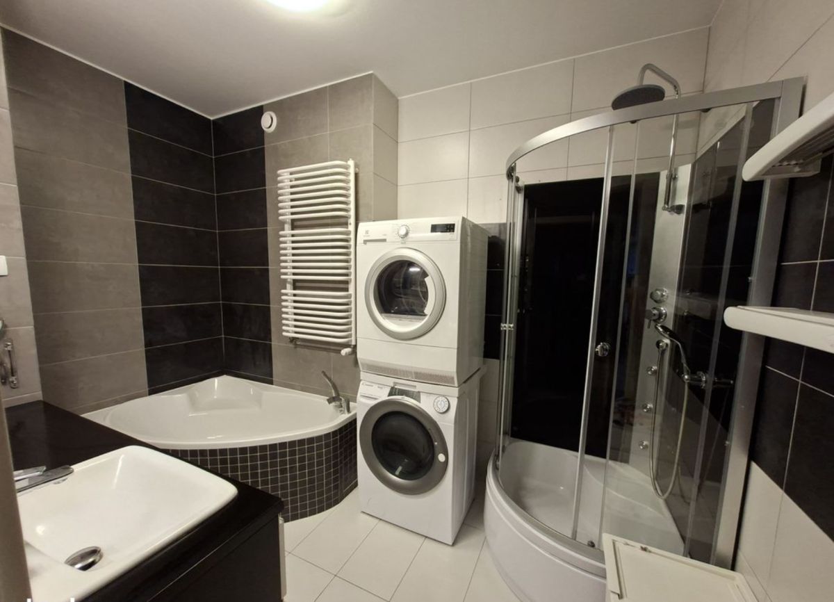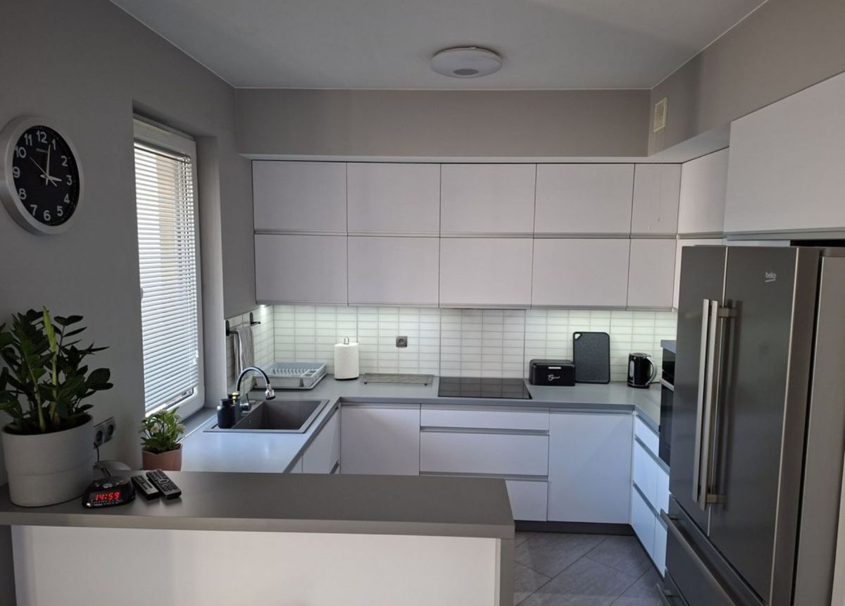 W cenie mieszkania uwzględniono zabudowę kuchenną wykonaną na wymiar wraz ze sprzętem AGD, szafy wnękowe, meble łazienkowe, a także pralkę i suszarkę do ubrań.