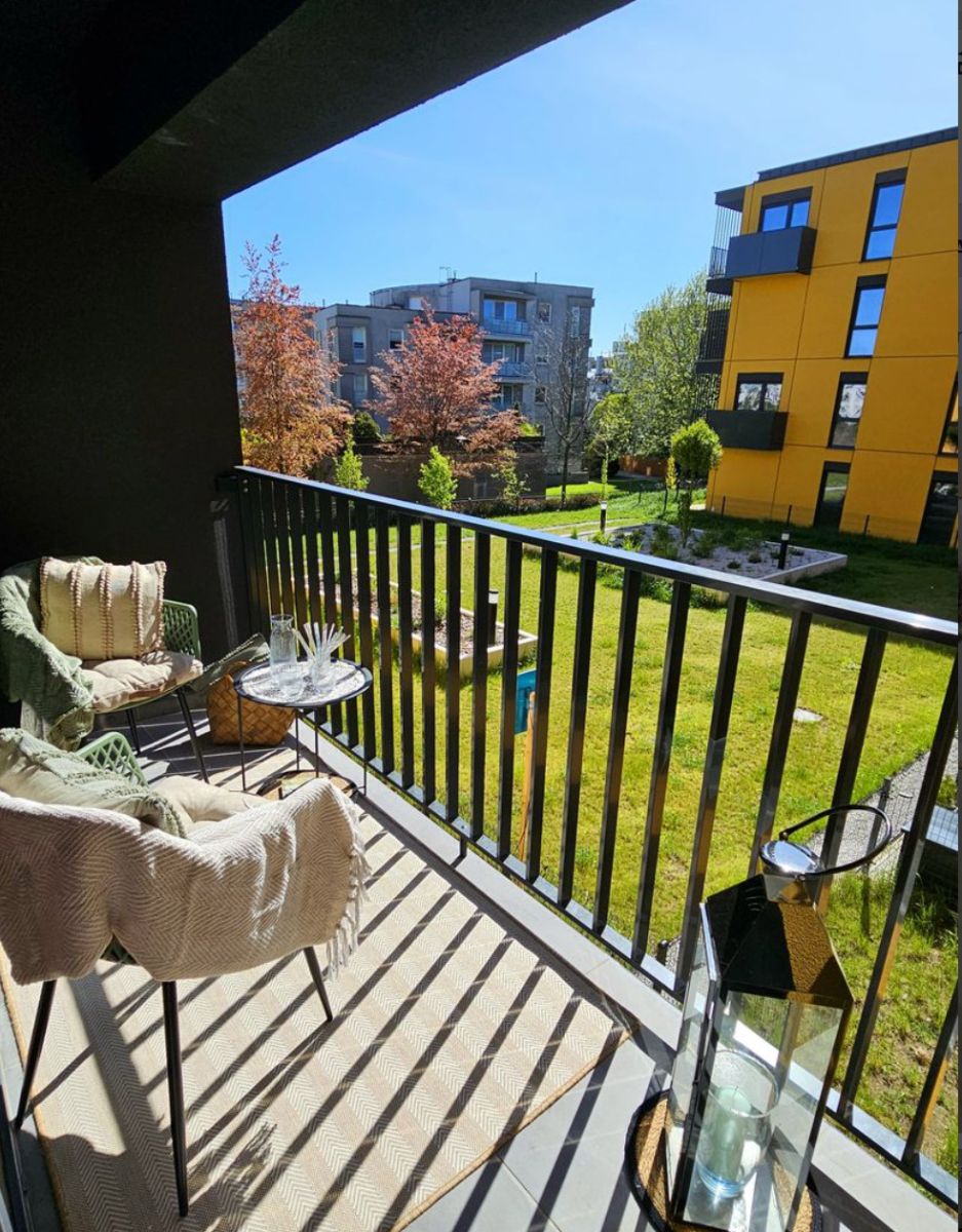 - balkonu, z którego widok wychodzi na zaciszną, zieloną część osiedla oraz zieleń odgradzającą pobliskie bloki. Południowo-zachodnia ekspozycja zapewnia jasne, słoneczne wnętrza i sprzyja relaksowi na balkonie.