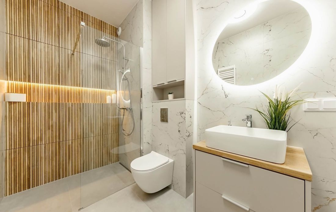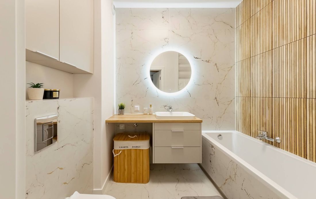 - duża łazienka z wanną, umywalką, szafką i oświetleniem LED 4,12m2
