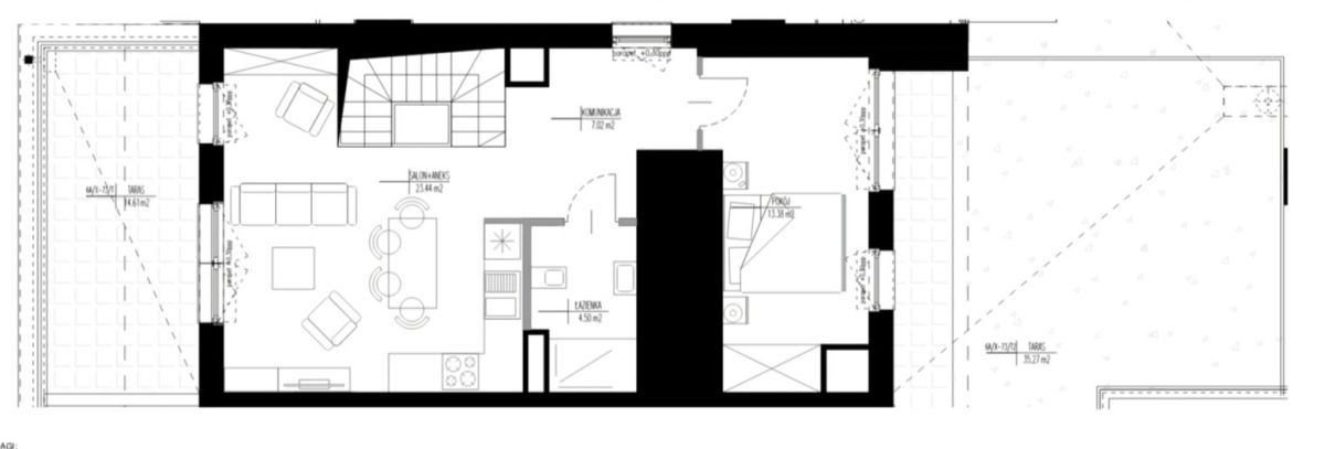 - strefa relaksu z miejscem na RTV, kanapa, stolik kawowy