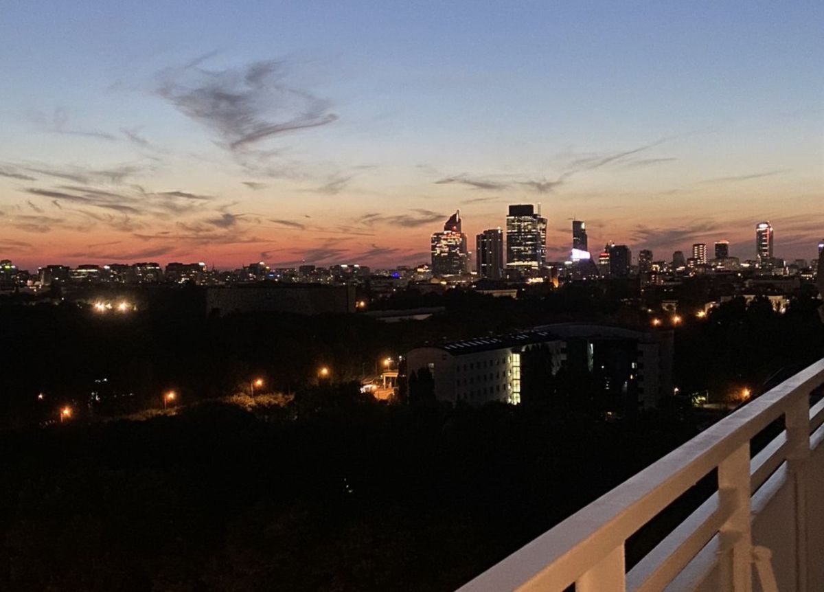 Z balkonu rozciąga się imponująca panorama Centrum Warszawy zapierająca dech w piersiach zarówno w ciągu dnia, jak i wieczorem.