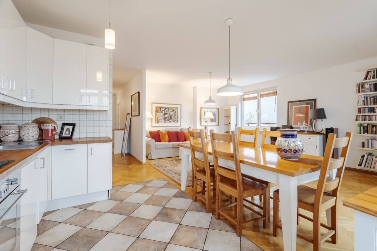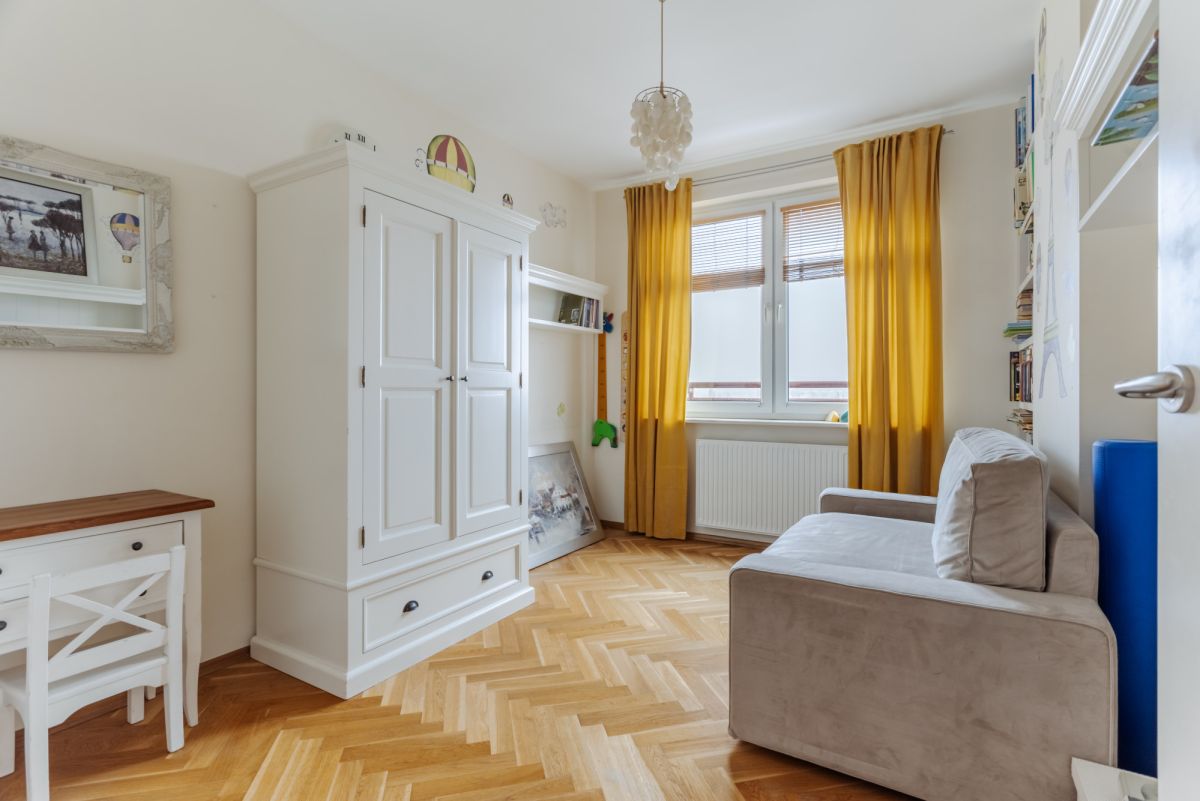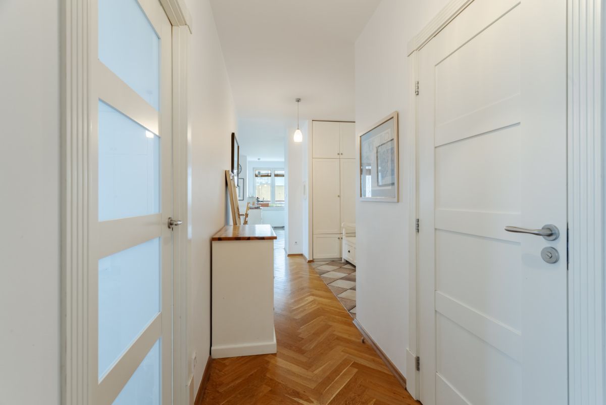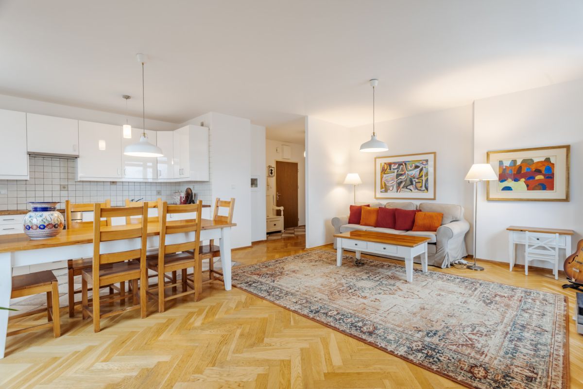 Funkcjonalny układ wnętrza, duży i foremny salon połączony z otwartą kuchnią , zapewniający komfort i przestronność, dodatkowe trzy duże okna gwarantują dużo naturalnego światła i perspektywę na Łazienki oraz centrum stolicy. Na podłogach parkiet drewniany i gres.