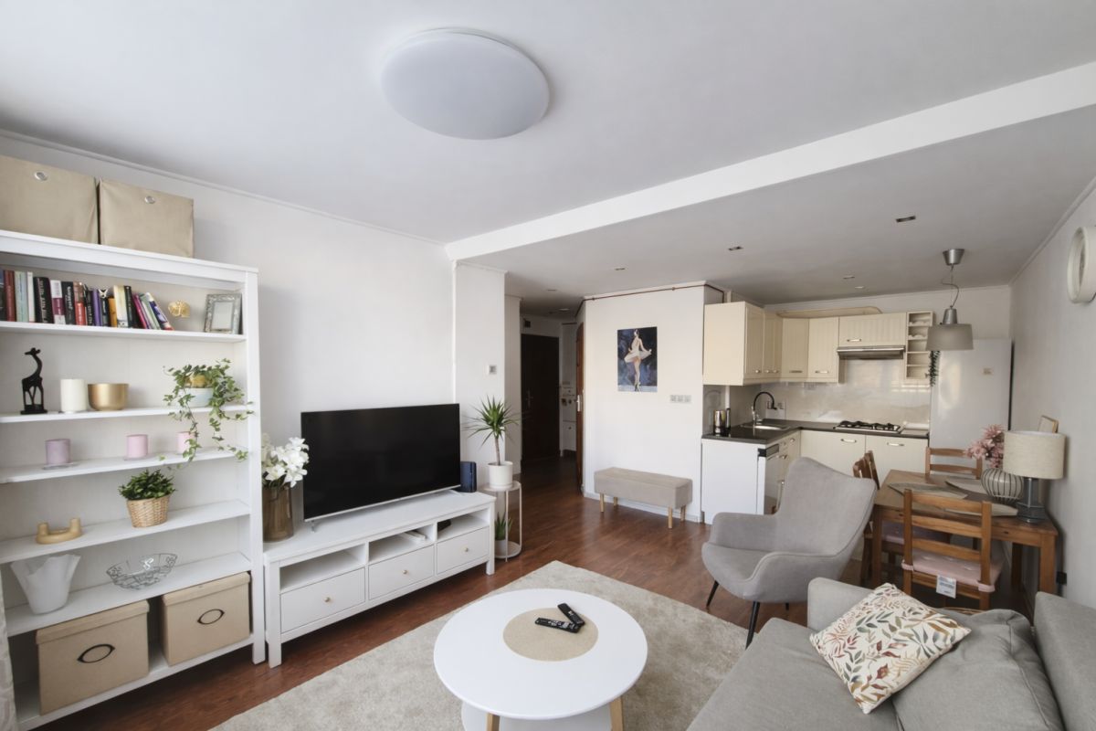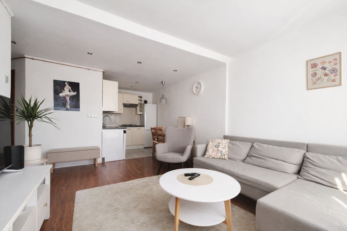 przestronny salon z aneksem kuchennym oraz wyjściem na balkon,