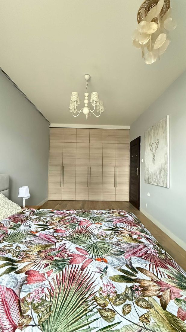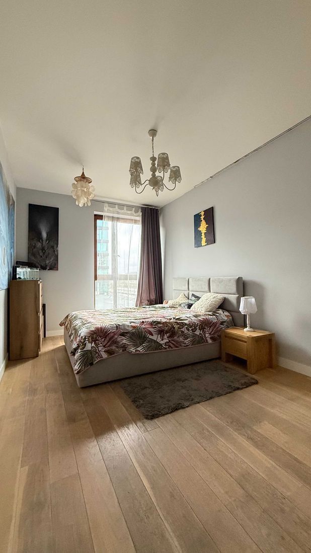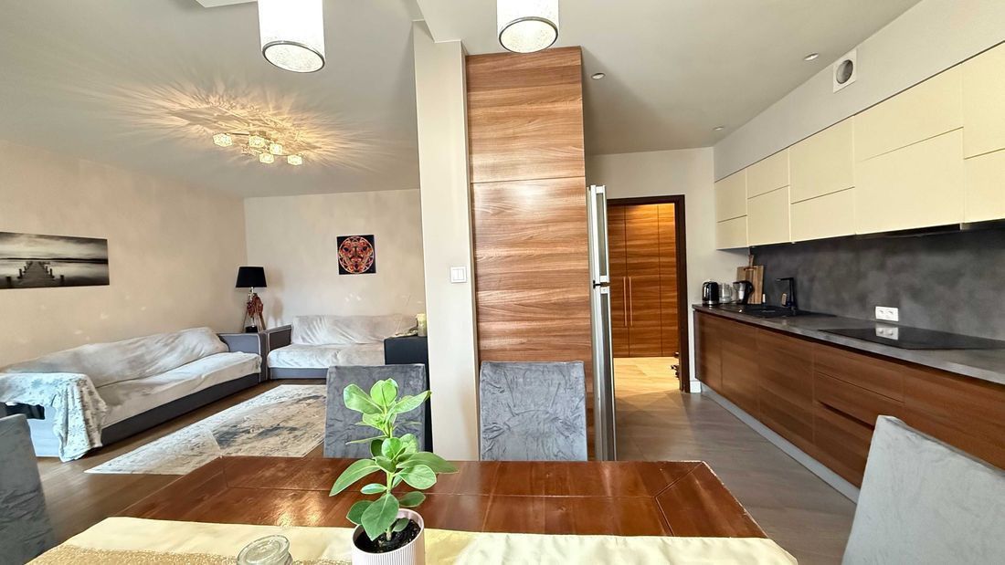 Przestronny apartament o powierzchni prawie 100 m2, z funkcjonalnym układem pomieszczeń i dużymi oknami, bez widoku na główną ulicę.