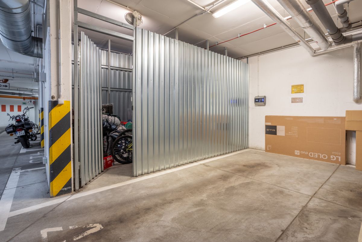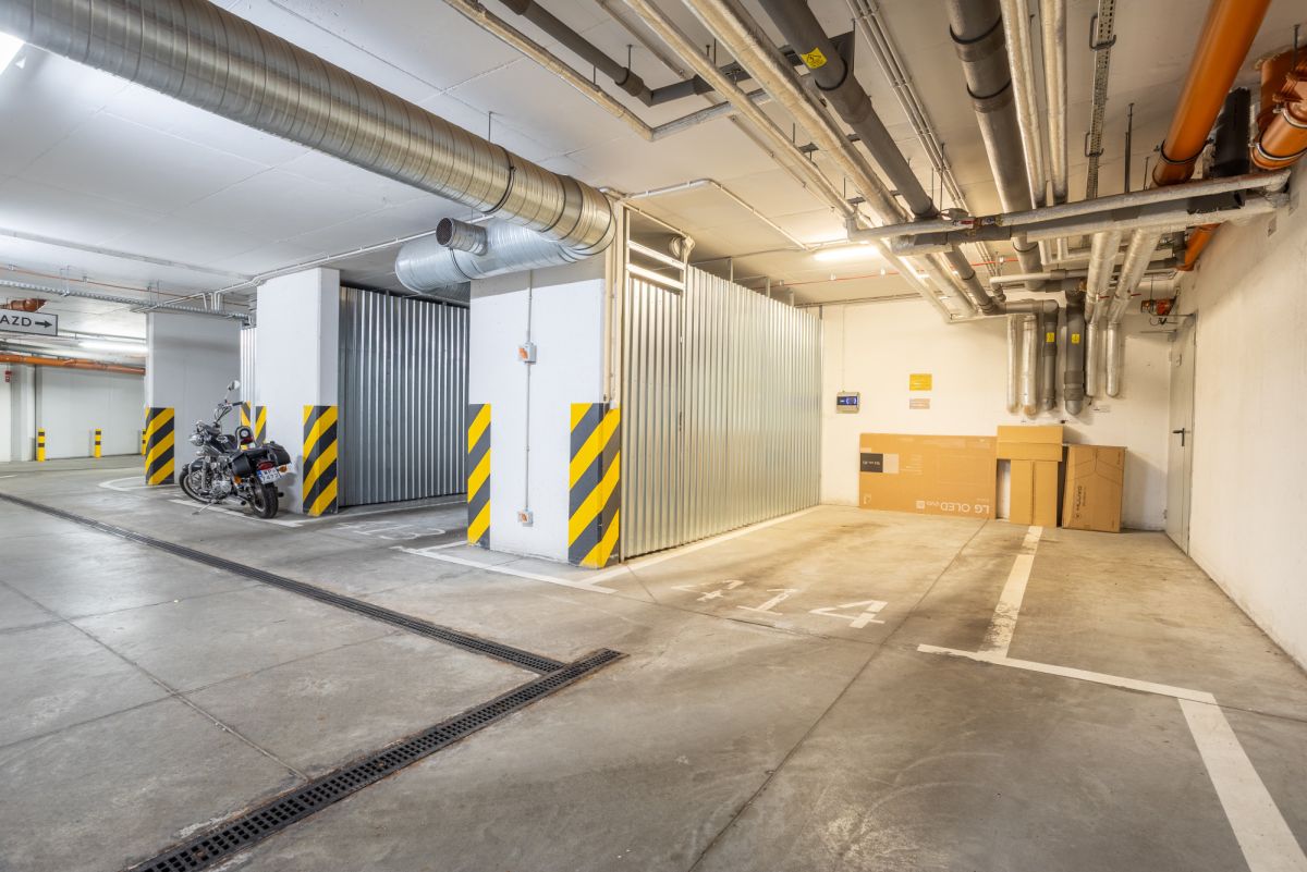Miejsce postojowe w garażu podziemnym, bardzo szerokie, wygodne, wyposażone w ładowarkę elektryczną do samochodu - płatne dodatkowo 50 000 zł.