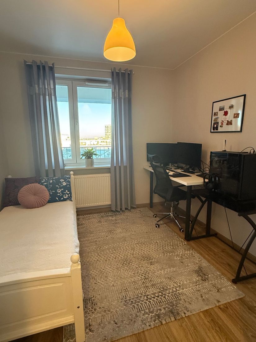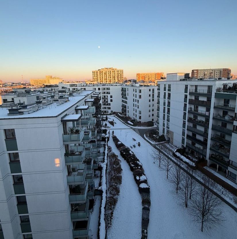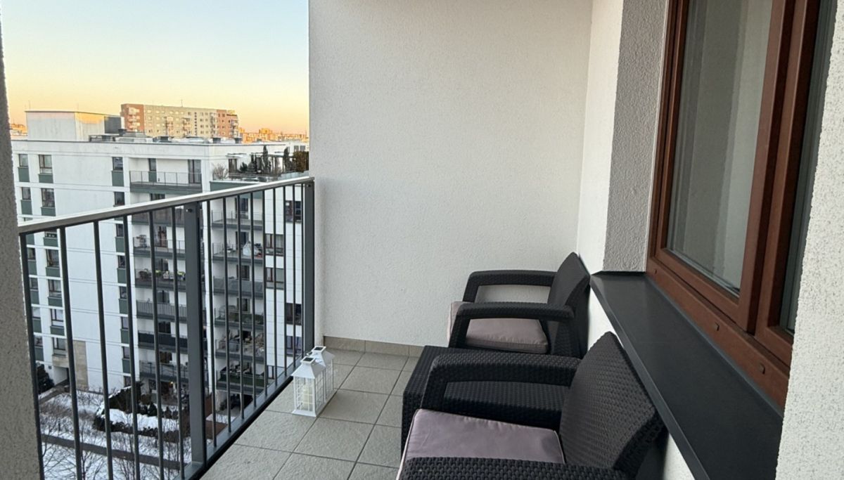 Zadbane mieszkanie z dwustronnym widokiem na zachód i południowy wschód. Z salonu wyjście na balkon z widokiem na wewnętrzne patio, natomiast z sypialni wyjście na zamykaną loggię z widokiem na tereny zielone i panoramę.