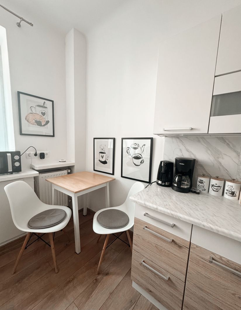 Kuchnia wyposażona w sprzęt AGD (lodówka, zmywarka, mikrofala, kuchenka gazowa).