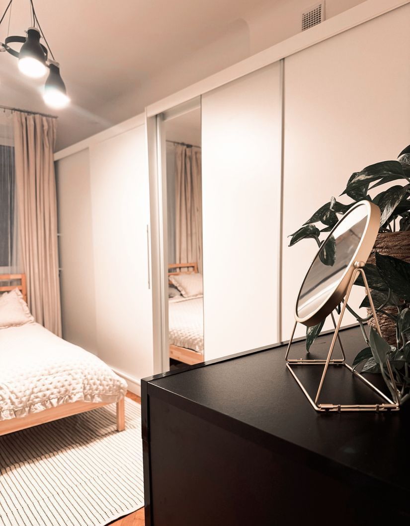W mieszkaniu duża ilość zabudowy i przestrzeni do przechowywania.