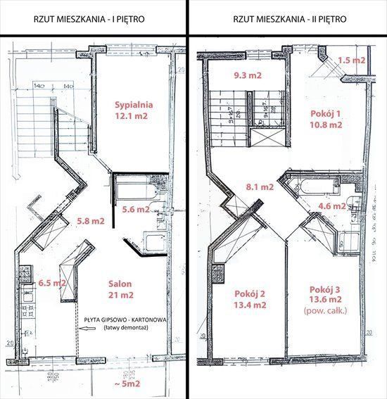 - Salon (21 m2) z kuchnią (6.5 m2) aktualnie oddzielone płytą gipsowo - kartonową (łatwy demontaż)