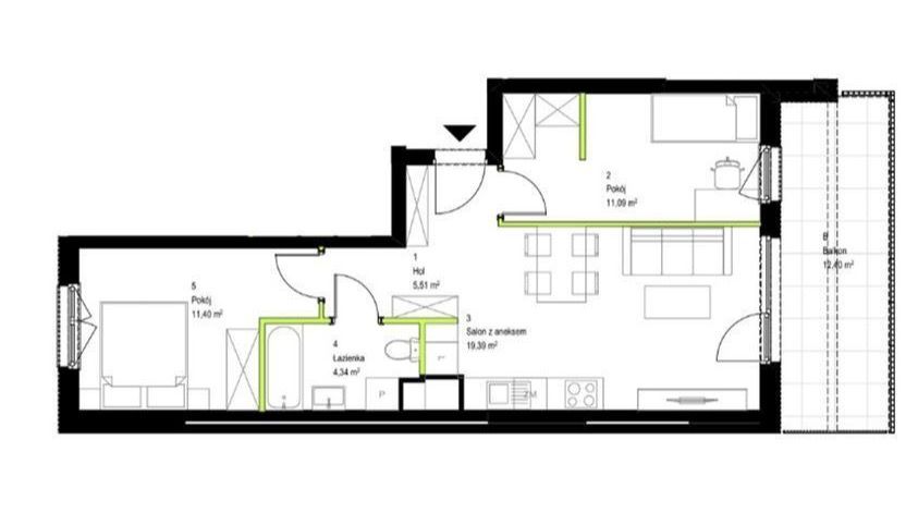 Komfortowy układ 3 pokoje, 2 sypialnie, duży balkon: 12.4 m²