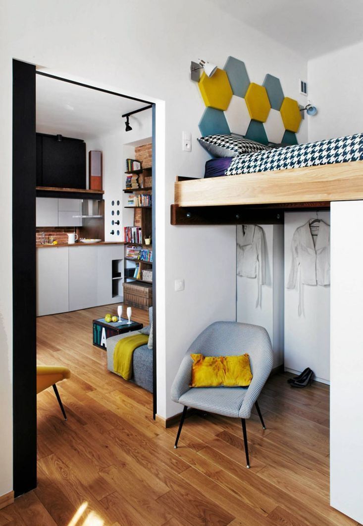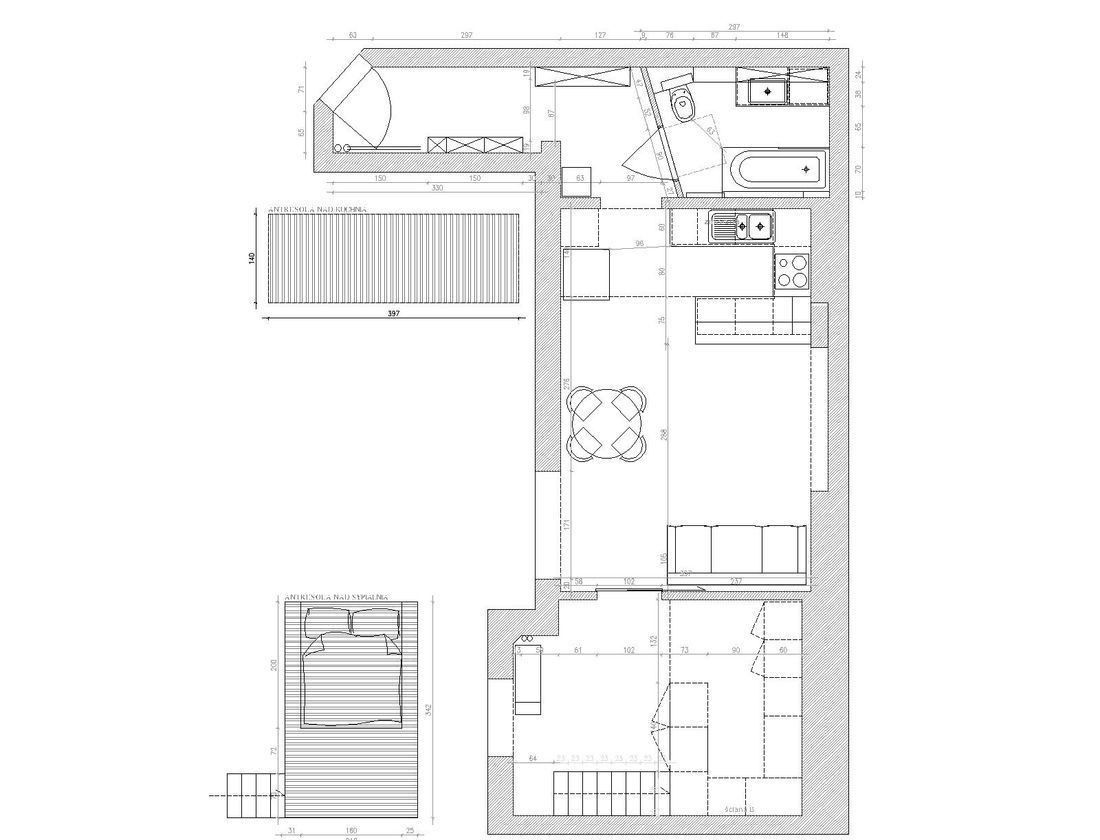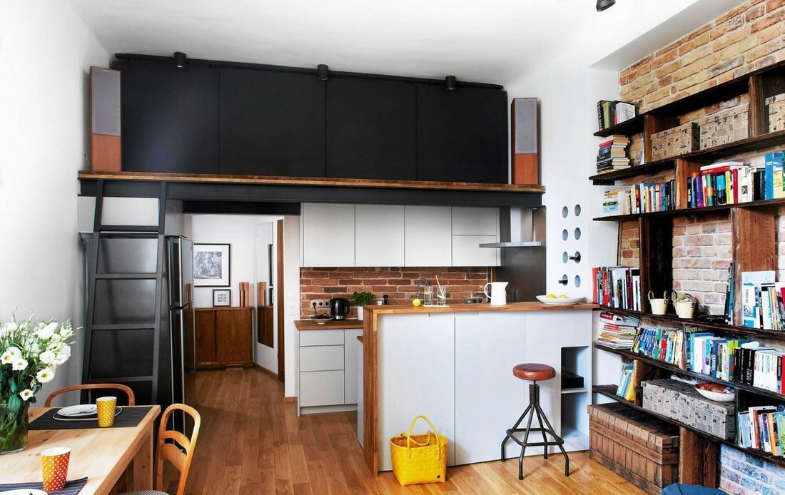 Projekt autorski architekta, łączący styl kamieniczny i elementy loftu.- Na podłogach: lita deska dębowa oraz płytki w łazience i przedpokoju.- Salon: sofa z funkcją spania, fotel, duży regał, telewizor, drewniany stół z 4 krzesłami, stolik kawowy.- Aneks kuchenny: wysokiej klasy sprzęt AGD (lodówka, piekarnik, zmywarka, okap, czajnik), pełne wyposażenie w naczynia, sztućce, garnki i szkło.- Łazienka: wanna z parawanem, umywalka, toaleta, pralka w zabudowie, grzejnik z grzałką elektryczną.- Sypialnia: garderoba pod antresolą i wygodne łóżko na antresoli.
