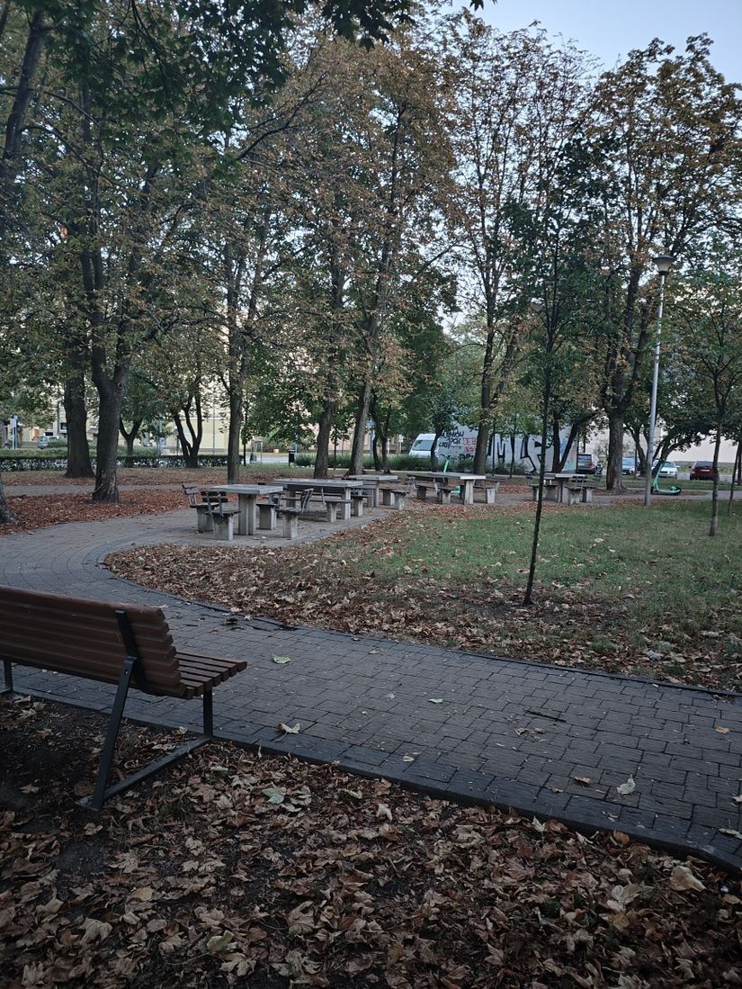 Widok z okna na park ze stolikami do gry w szachy - cisza i spokój. W pobliżu dużo różnych sklepów i knajp.