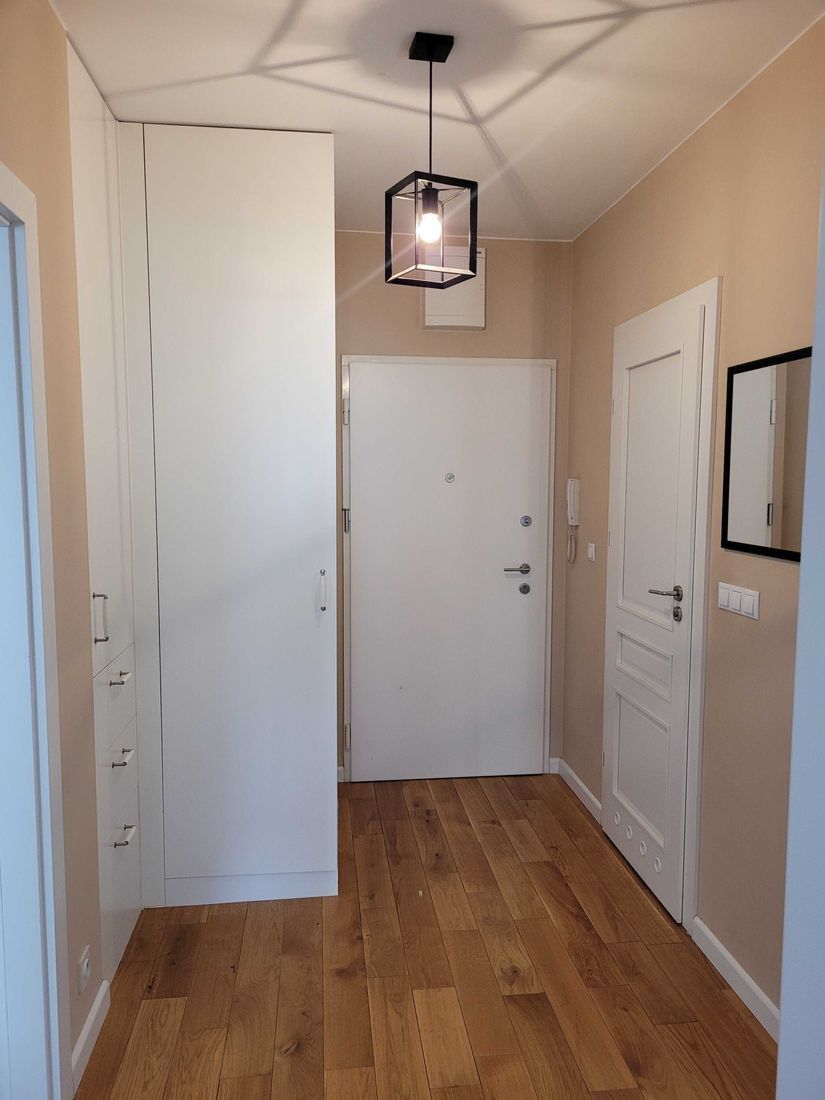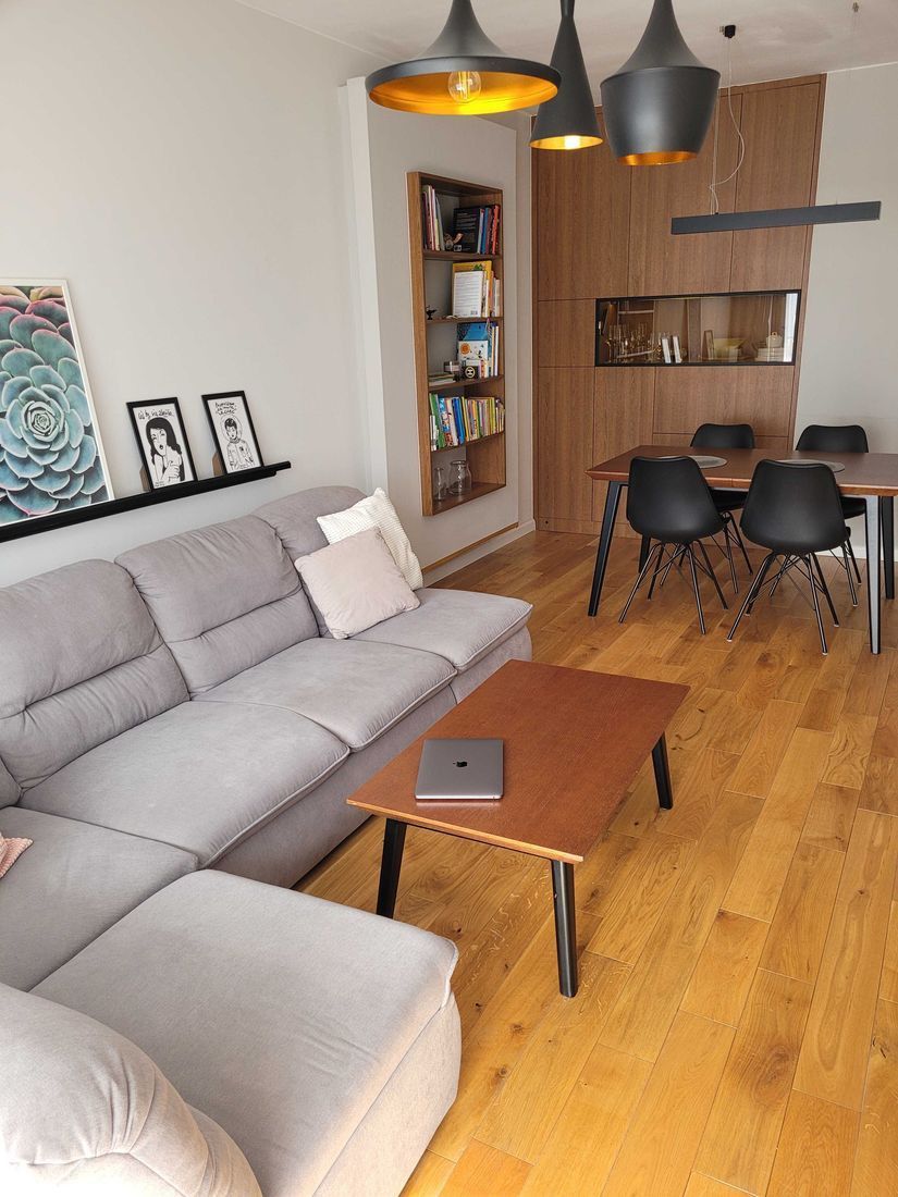 Komfortowe i rozkładowe mieszkanie. Lokal w bardzo dobrym stanie, gotowe do zamieszkania — bez potrzeby remontu. Większość mebli wykonana na wymiar, z wysokiej jakości materiałów. Na podłodze lity dąb, w kuchni i łazience terakota.