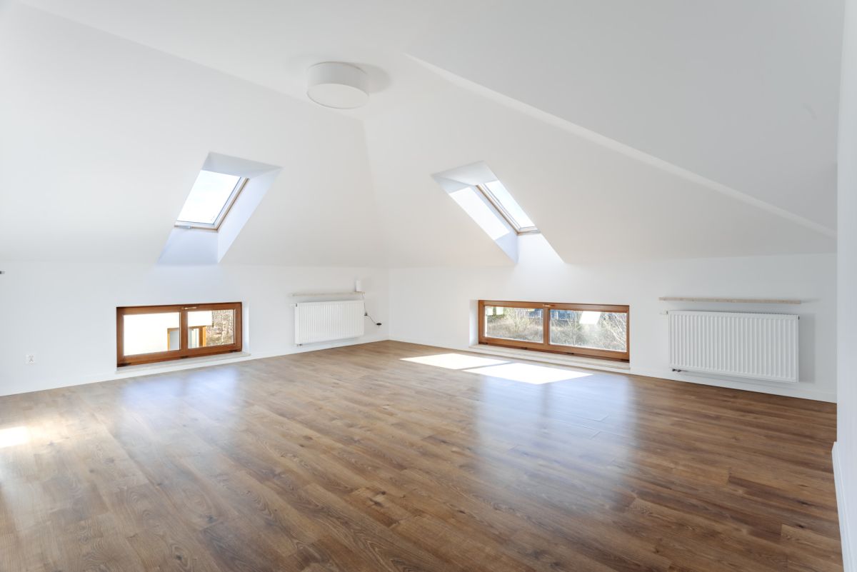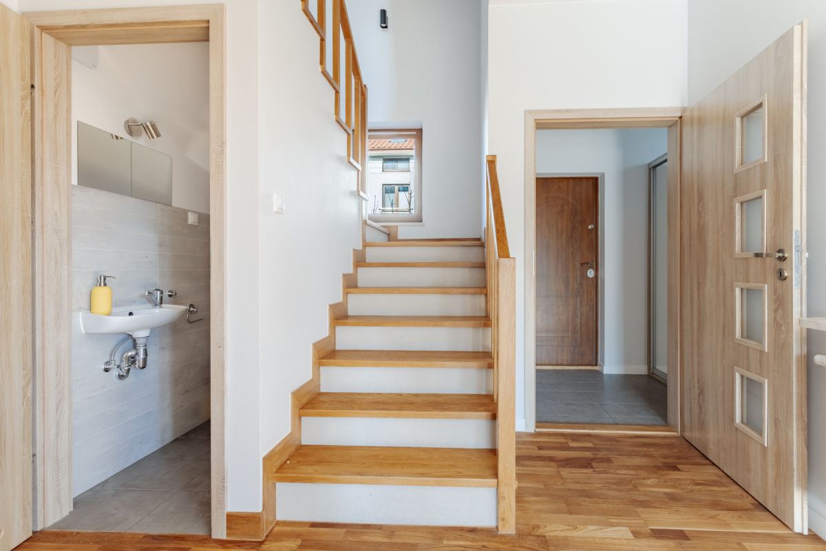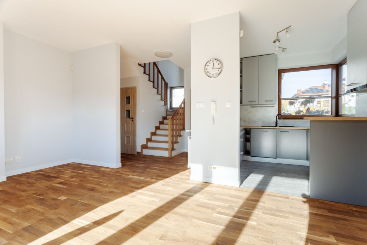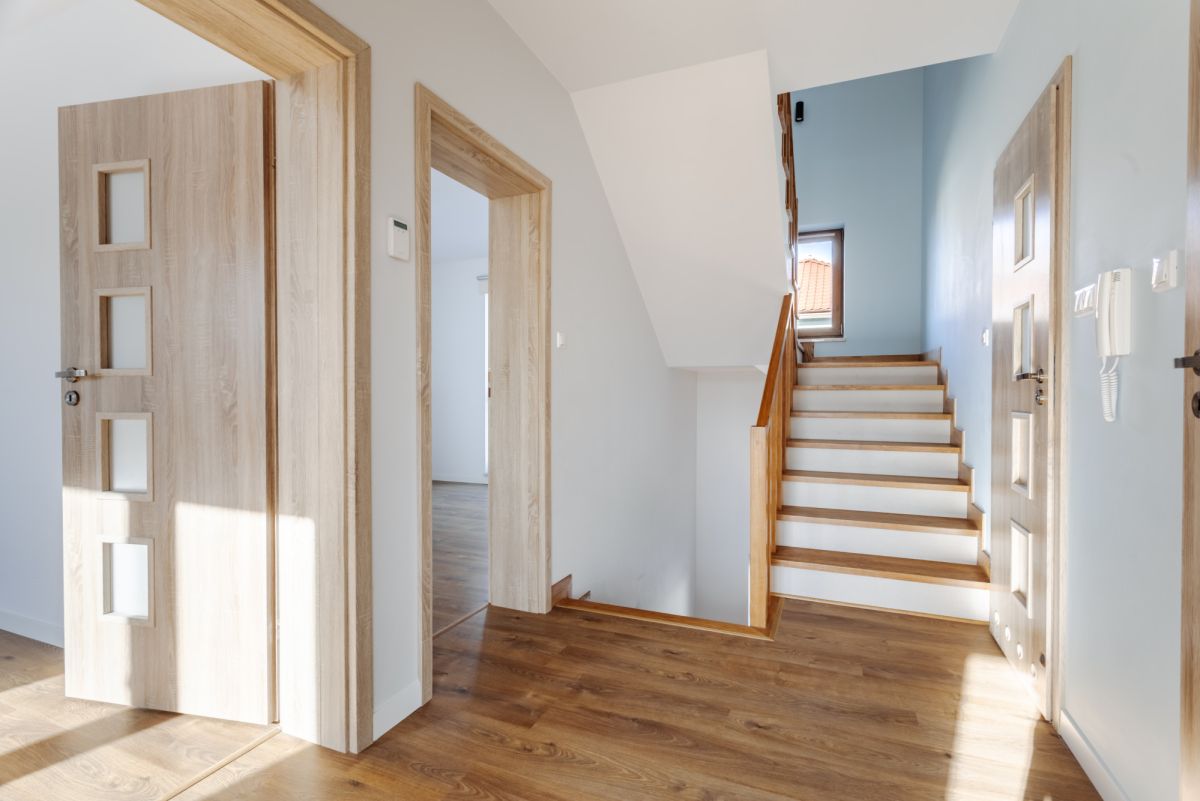 Wysoki standard domu: drewniana podłoga na parterze i schodach, drewniane okna.