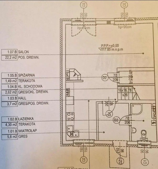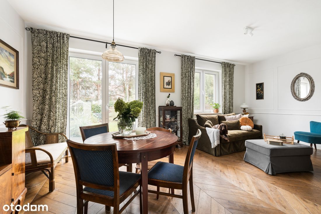 Parter: przestronny salon (22 m2) z kominkiem, z wyjściem na taras i ogród (w sumie 300m2 działki). Kuchnia (10 m2) jest w pełni umeblowana i wyposażona - gotowa do codziennego gotowania. Dla większego komfortu łazienka z prysznicem (4 m2) i pomieszczenie gospodarcze (2 m2).