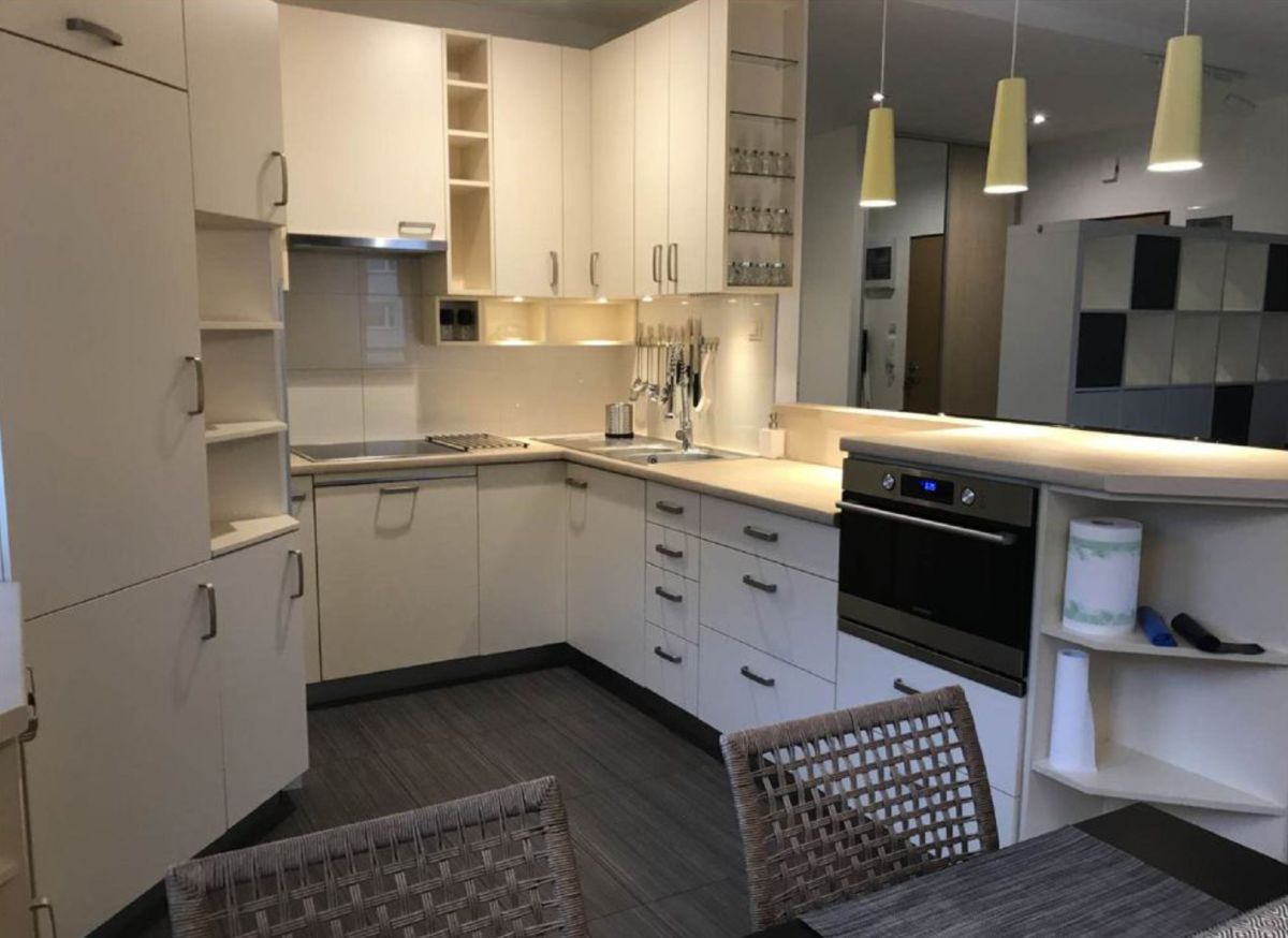 - kuchnia została wykończona gresem i wyposażona w meble w zabudowie, zlewozmywak, płytę indukcyjną Samsung, dużą lodówkę NoFrost marki Teka z zamrażarką, piekarnik z funkcją kuchenki mikrofalowej Samsung, zmywarkę Electrolux oraz okap podłączony do komina wentylacyjnego,