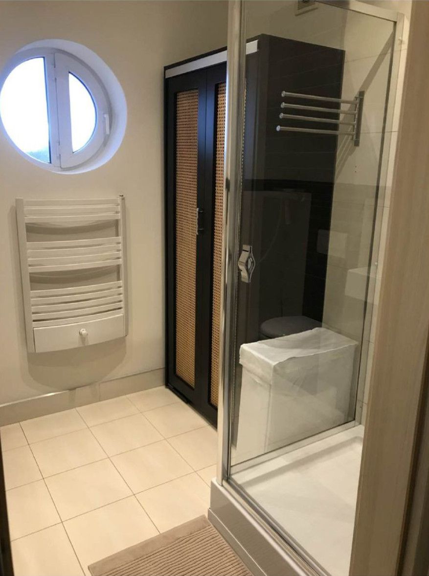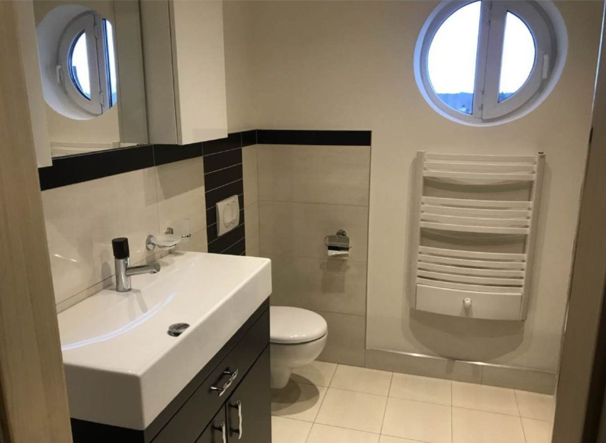 - łazienka wykończona jest gresem i wyposażona w szafkę z umywalką, WC w zabudowie Geberit, kabinę prysznicową, pralkę Bosch oraz dodatkowe szafki do przechowywania,