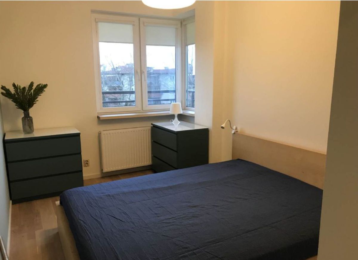 - w sypialni znajduje się drewniana podłoga, duże łóżko, dwie komody oraz pojemna szafa wnękowa,
