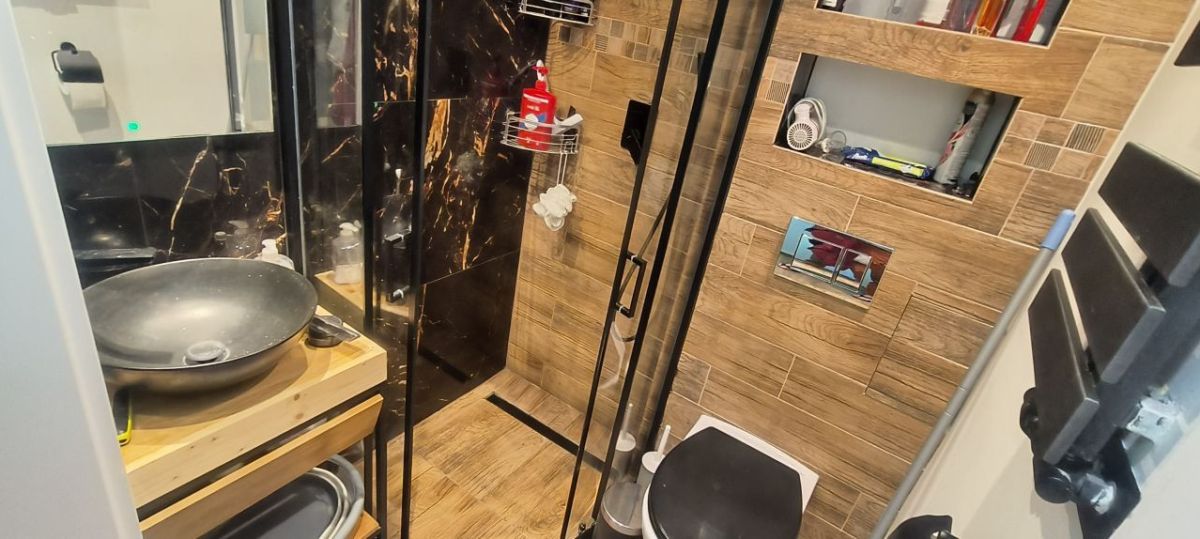 Łazienka: elegancko wykończona, z nowoczesną armaturą, kabiną prysznicową i stylowym oświetleniem