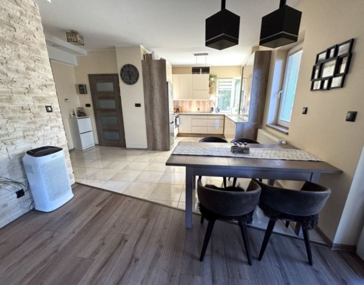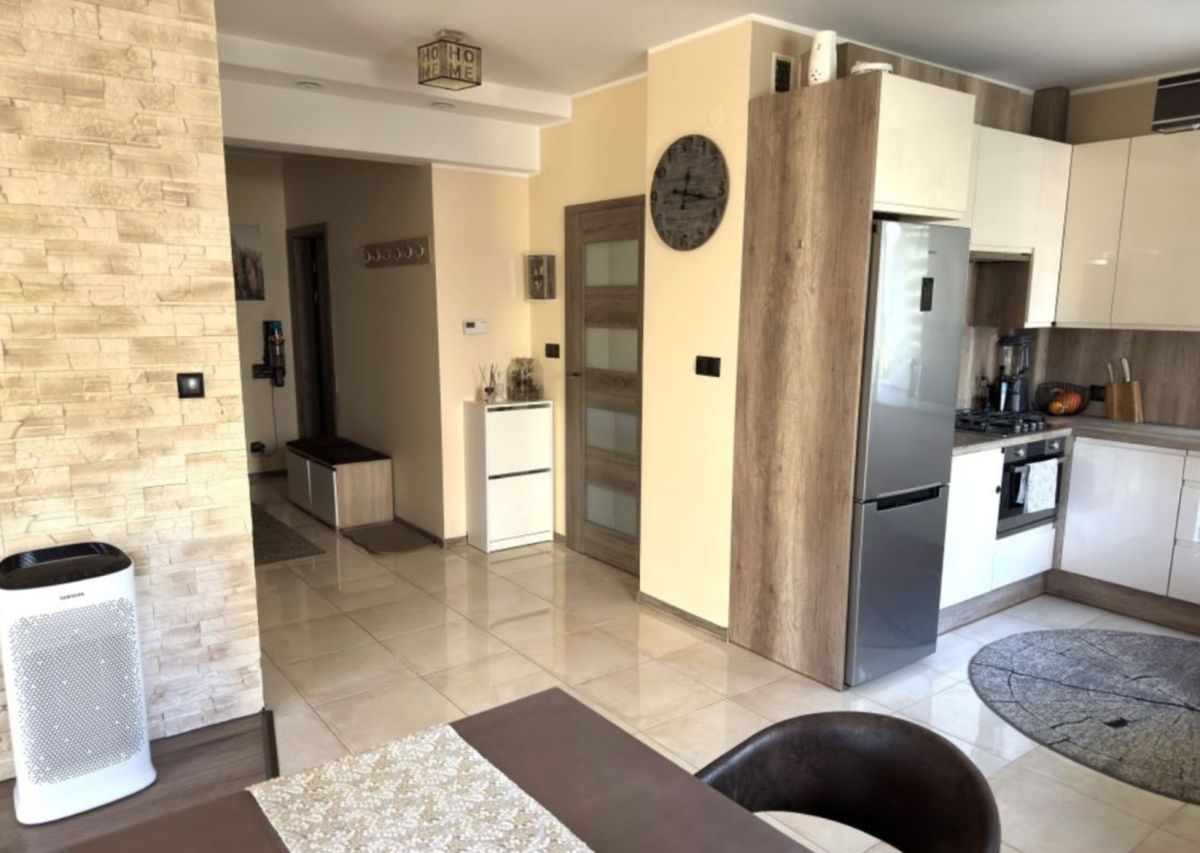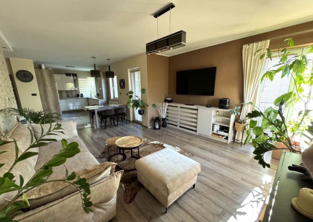 Przestronny salon połączony z jadalnią i kuchnią wyposażoną w sprzęt AGD. W salonie znajduje się wygodna, nowoczesna kanapa oraz duży telewizor. Jadalnia wyposażona w rozkładany stół wraz ze stylowymi krzesłami,