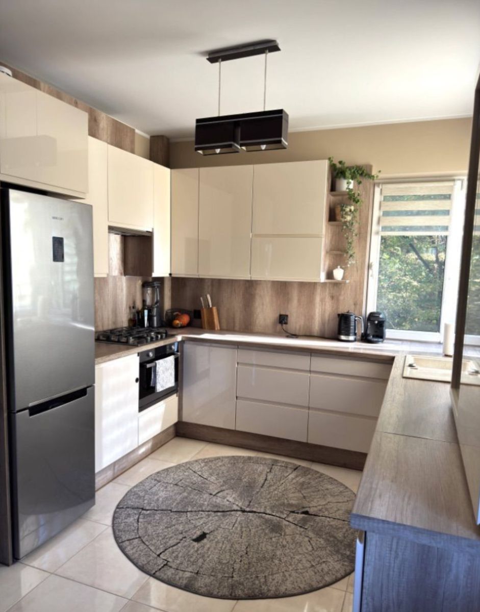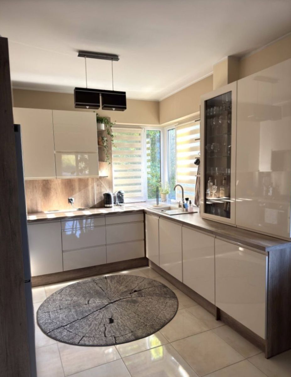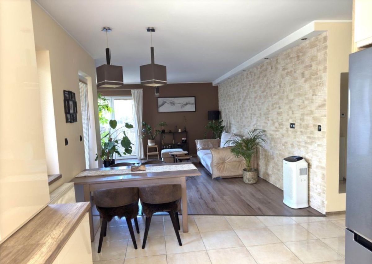 Przestronny salon połączony z jadalnią i kuchnią wyposażoną w sprzęt AGD. W salonie znajduje się wygodna, nowoczesna kanapa oraz duży telewizor. Jadalnia wyposażona w rozkładany stół wraz ze stylowymi krzesłami,