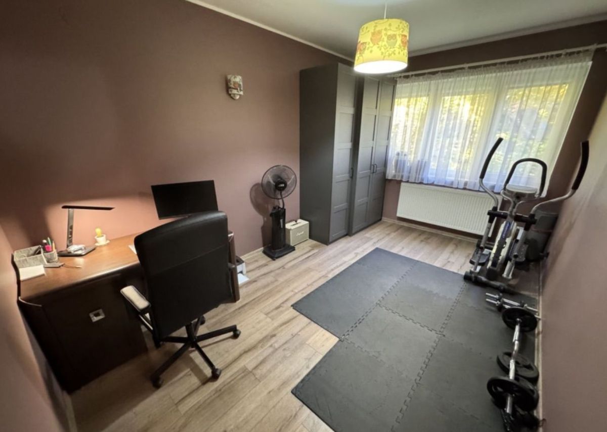Mieszkanie w pełni umeblowane: nowoczesna kanapa, meble biurowe, nowa szafa, łóżko, toaletka, sprzęt do ćwiczeń: orbitrek, maty wygłuszające pod sprzęt treningowy.