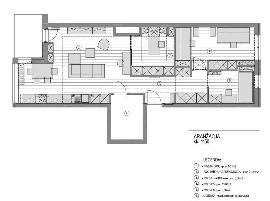 - salon z aneksem kuchennym 31m2 i z wyjściem na balkon