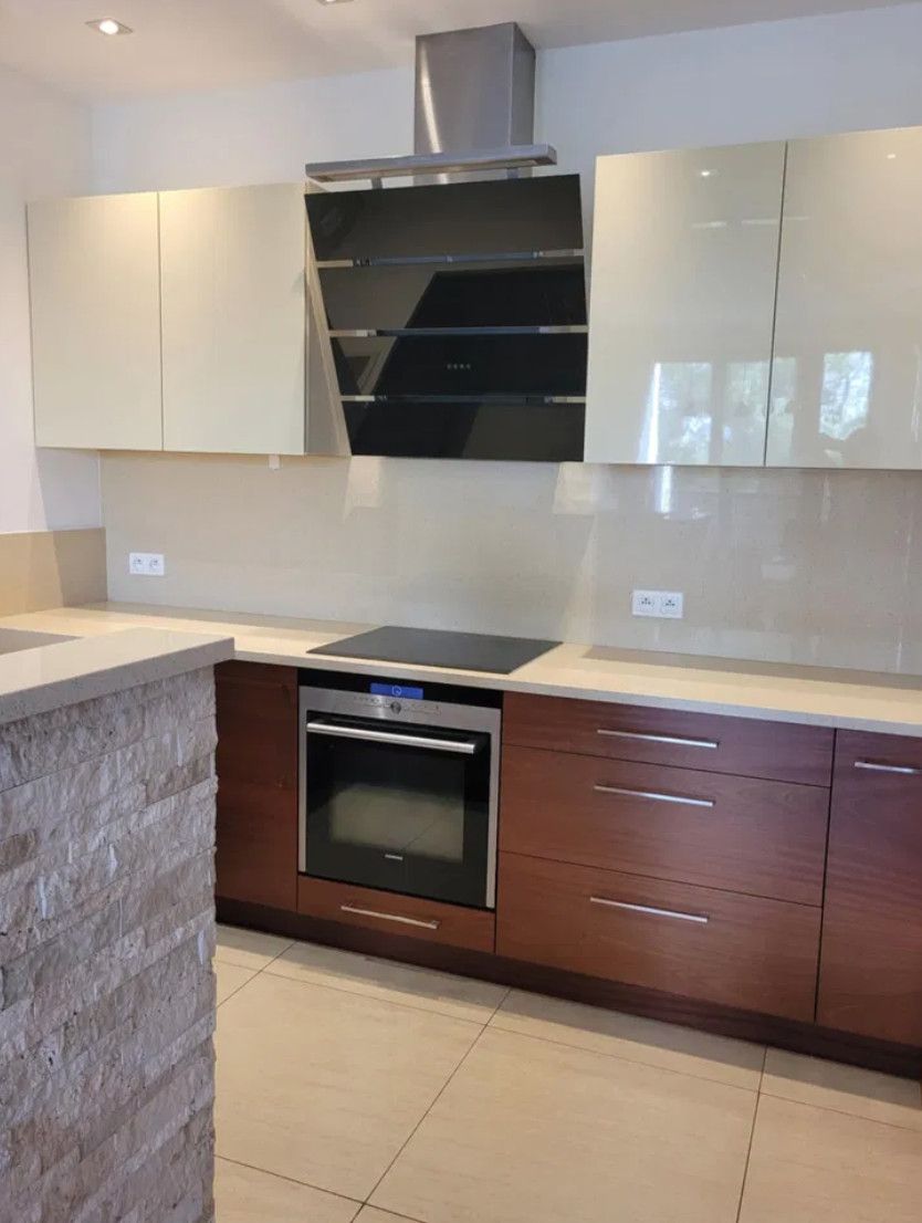 Sprzęt AGD to Bosh i Siemens, stolarka meblowa na zamówienie, kamień na ścianach Trawertyn, lampy Fabian.