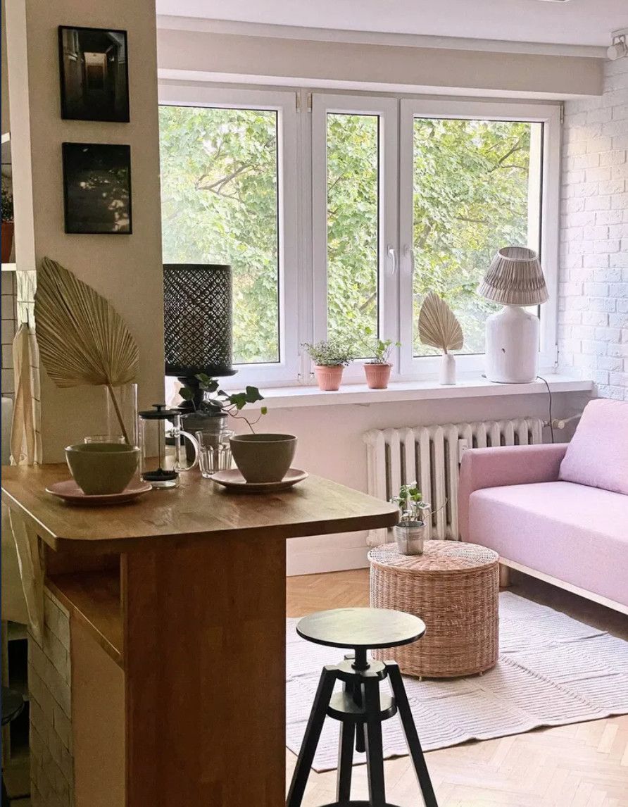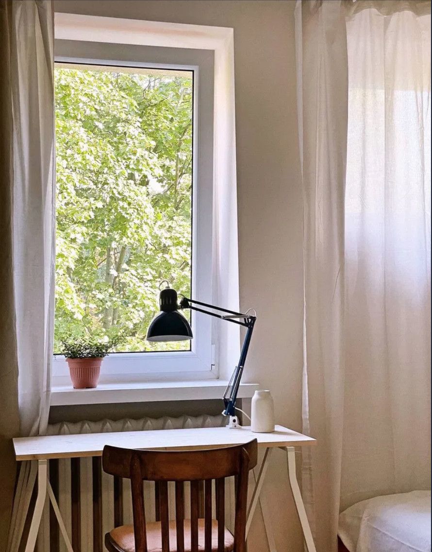Mieszkanie jest pełne naturalnego światła, z widokiem na otaczającą zieleń, a jego okna nie wychodzą na inne budynki, co zapewnia poczucie prywatności i spokoju.