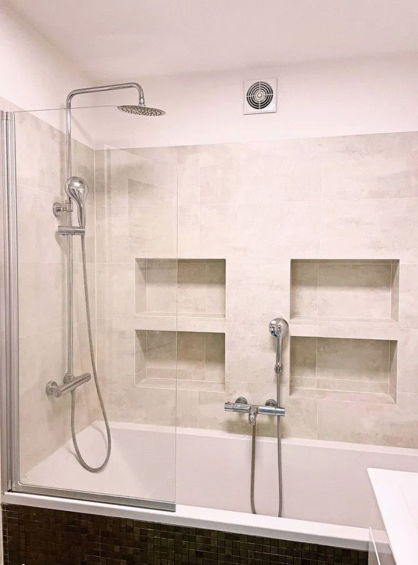 5. Łazienka: wanna z deszczownicą i parawanem prysznicowym, umywalka, szafka nad umywalką, wc