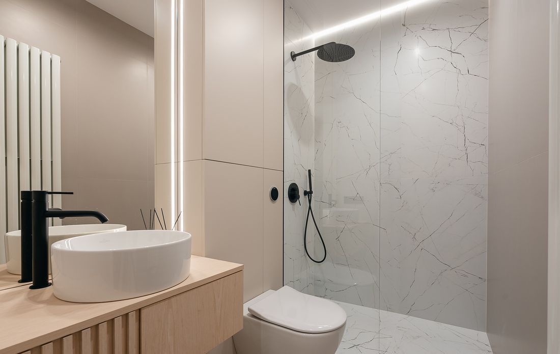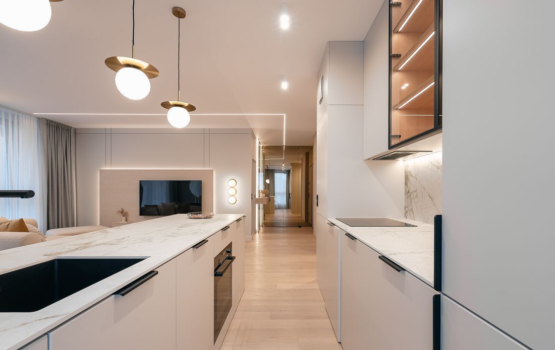 zabudowa stolarska z forniru wykonana na wymiar- blaty kuchenne wykonane ze spieku kwarcowego- oświetlenie warstwowe tworzy niepowtarzalny nastrój wewnątrz- armatura łazienkowa renomowanych marek: Villeroy&Boch, Tres, Marmorin- deska dębowa
