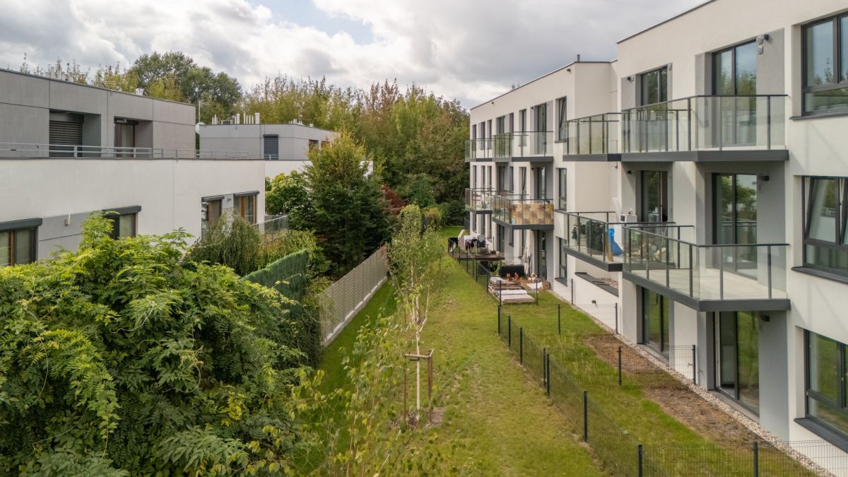 cicha, kameralna okolica z dużą ilością zieleni i niską zabudową,