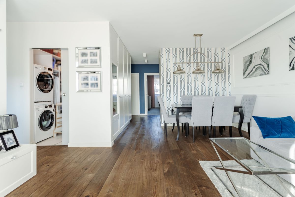 Dodatkowo dużo mebli w zabudowie wykonanych według indywidualnego projektu oraz kompletne wyposażenie AGD z pralką i suszarką.