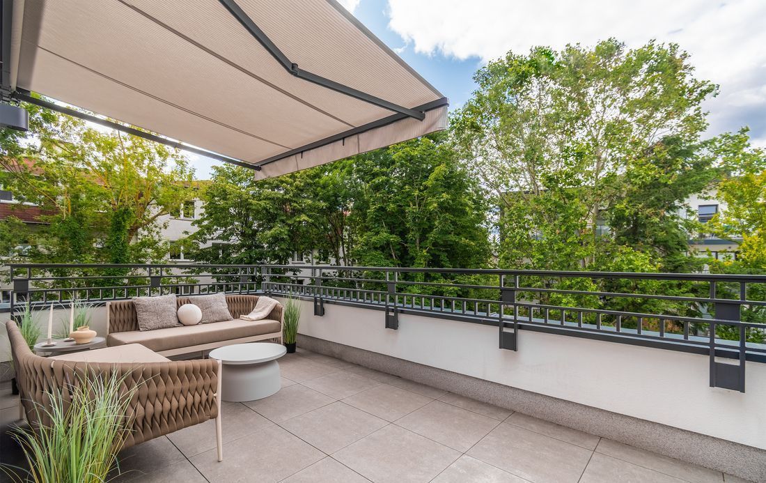 Pełna aranżacja wnętrz zaprojektowana przez architekta- taras - przestronny i słoneczny z widokiem na zieleń.