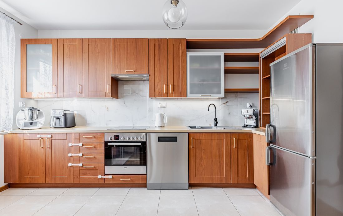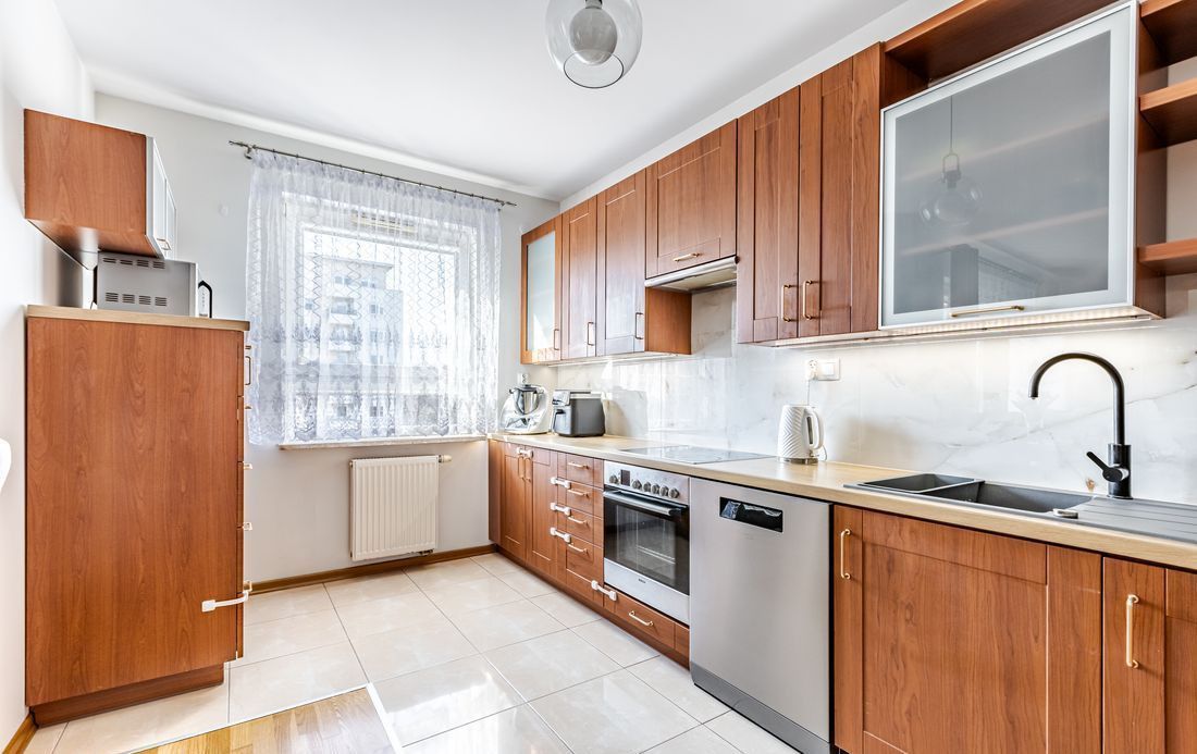 Kuchnia w pełni wyposażona (zmywarka, lodówka, piekarnik, płyta elektryczna), z dużą ilością zabudowy.