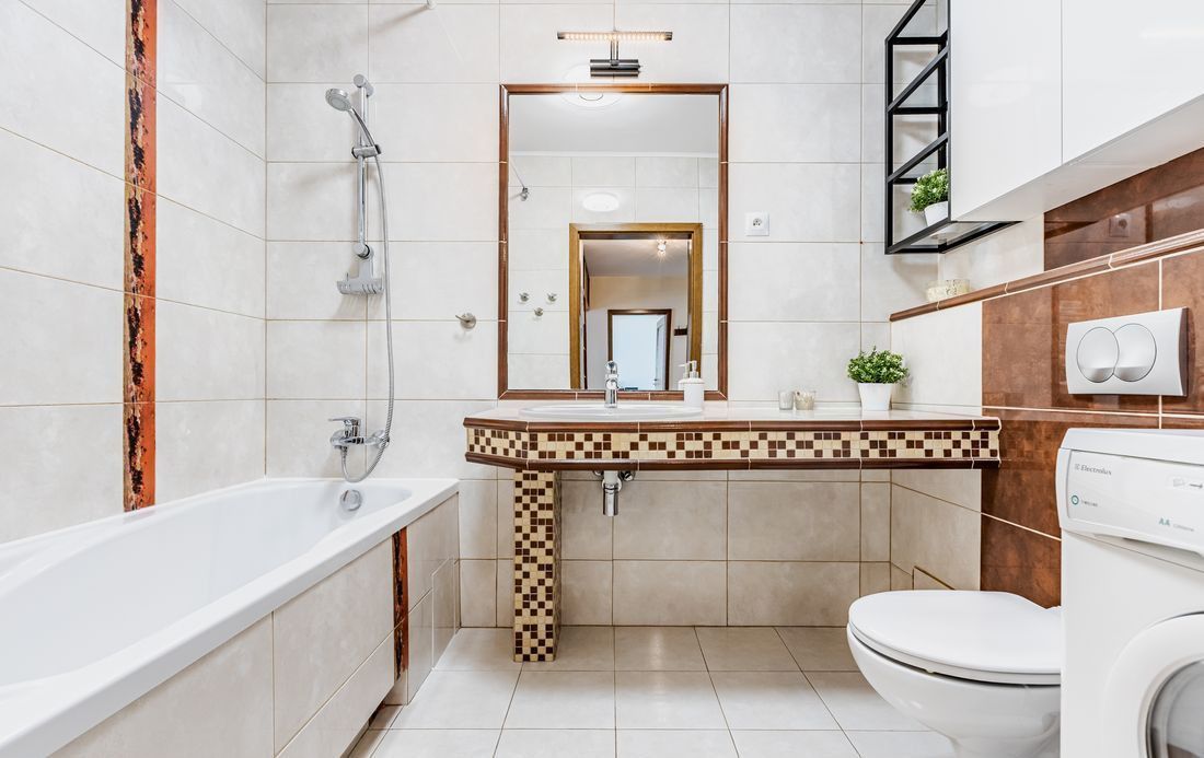 Łazienka wyposażona w wannę oraz pralkę.