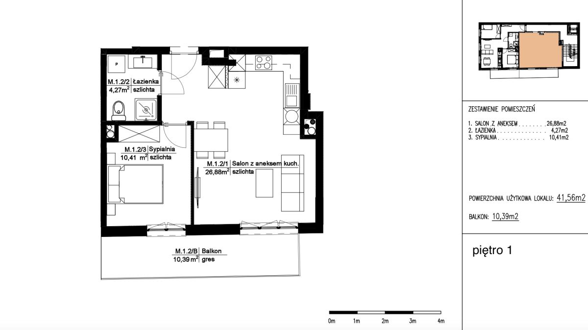 Mieszkanie ma powierzchnię 41,56 m2 i składa się z:
