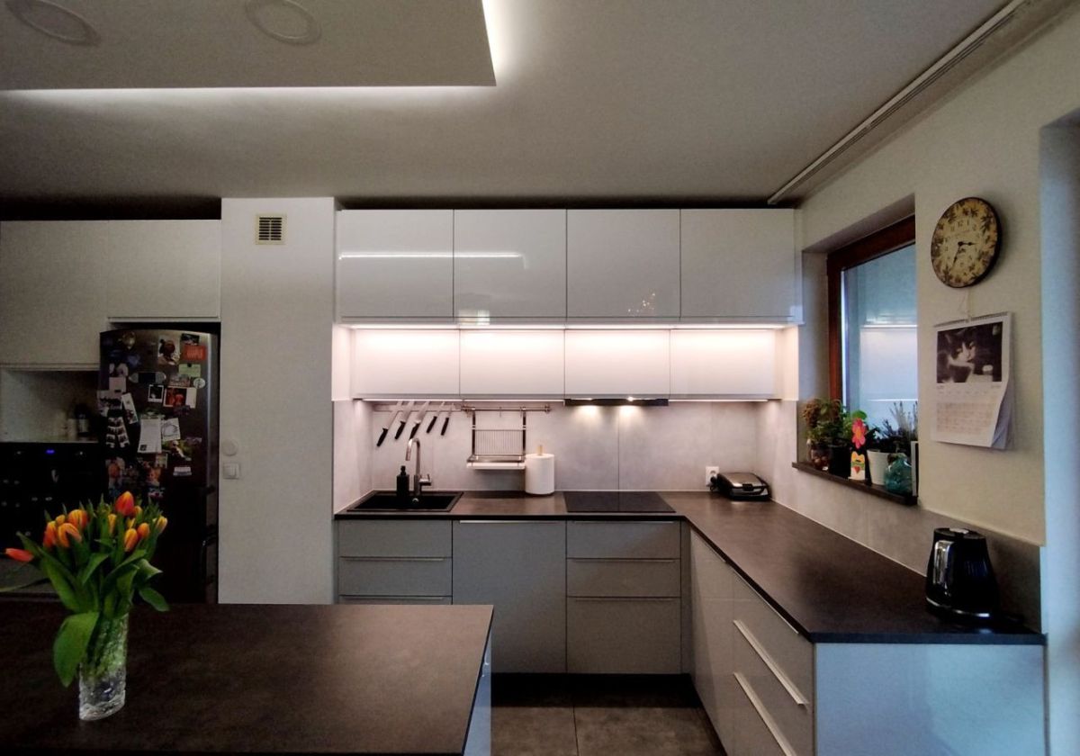 Salon z aneksem kuchennym tworzy komfortową przestrzeń dzienną z częścią wypoczynkową i jadalnianą. Kuchnia wyposażona jest w sprzęty AGD: lodówkę, piekarnik i zmywarkę.