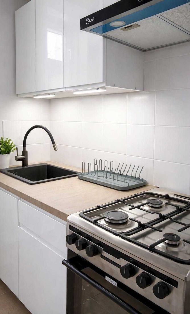Nowa zabudowa kuchenna (szafki, kuchenka, okap)