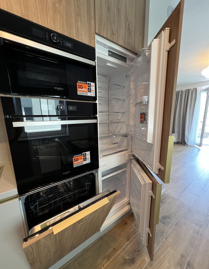 Aneks kuchenny na wymiar, wyposażony w nowy sprzęt AGD premium: zmywarka, lodówka w zabudowie, piekarnik, mikrofalówka, płyta indukcyjna i okap.