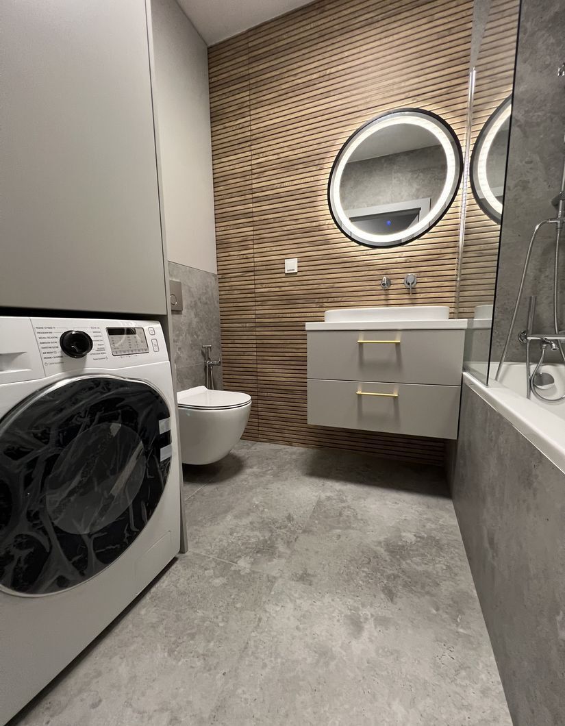 Przestronna łazienka z pralko-suszarką i wygodnym prysznicem typu walk-in.