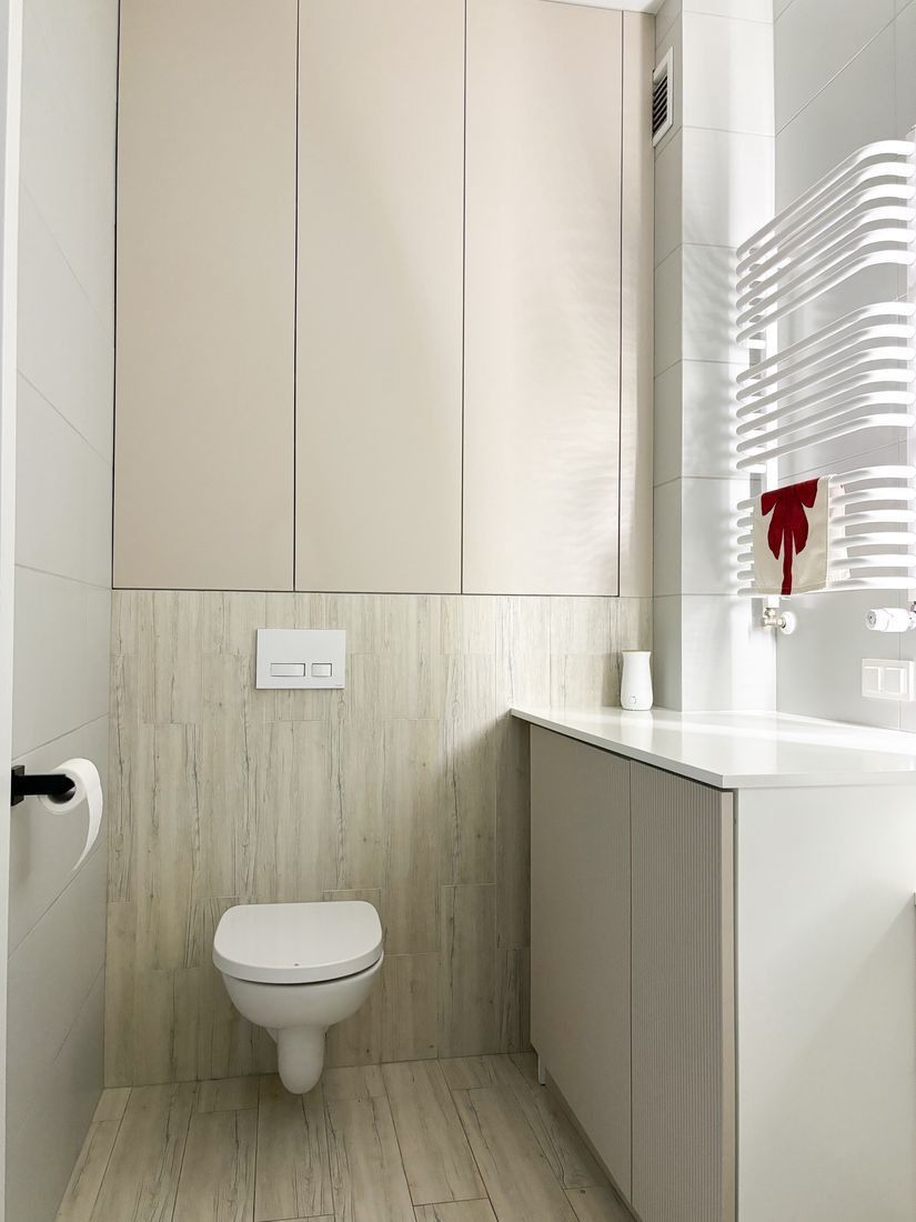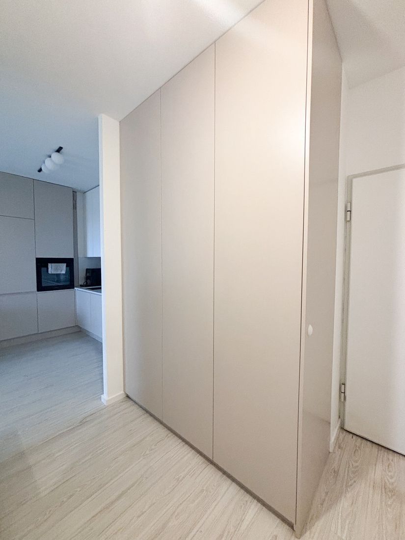 Przestronny przedpokój z wielką zabudowaną szafą a w niej ukrytą suszarka na ubrania.