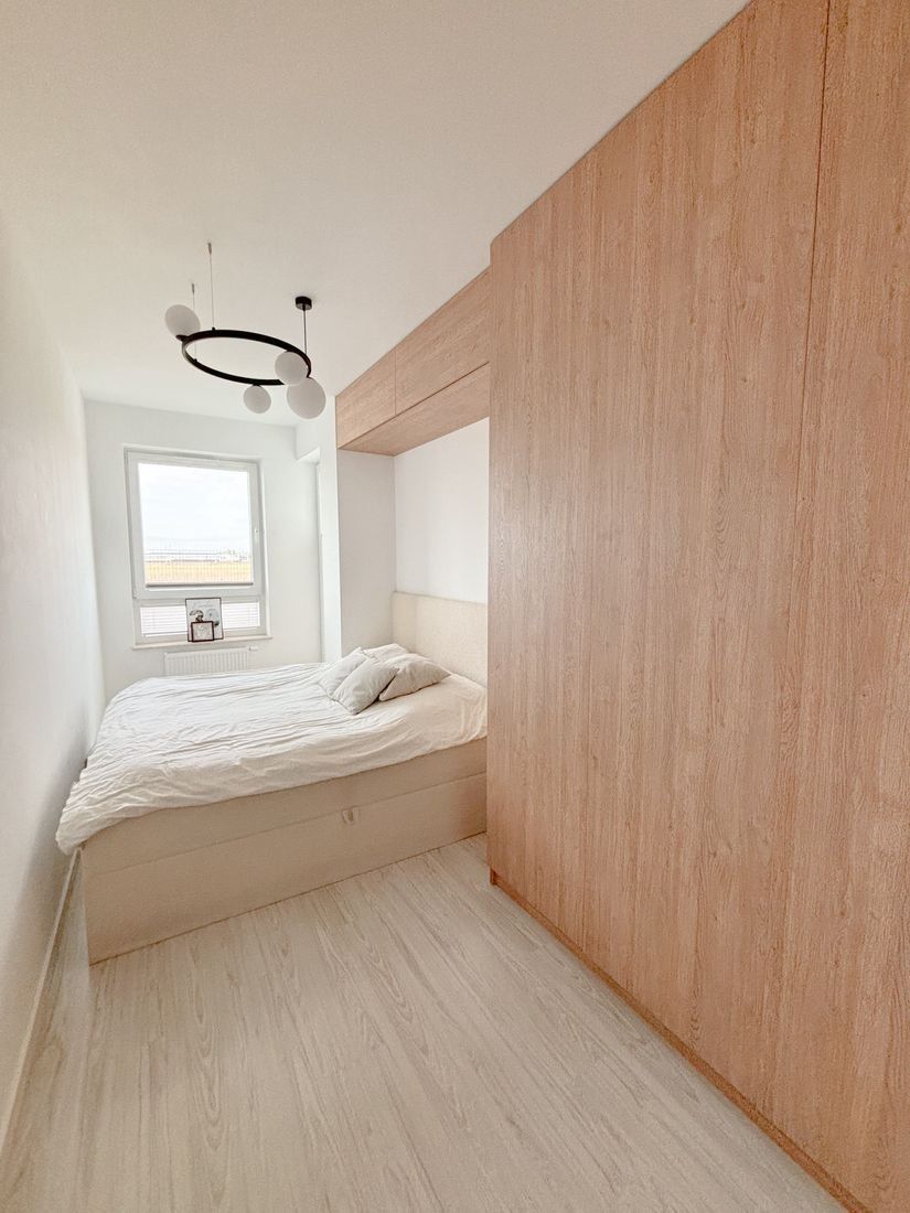 Sypialnia z dużym nowoczesnym łóżkiem i pojemną szafą w zabudowie.