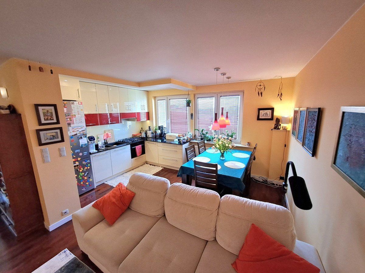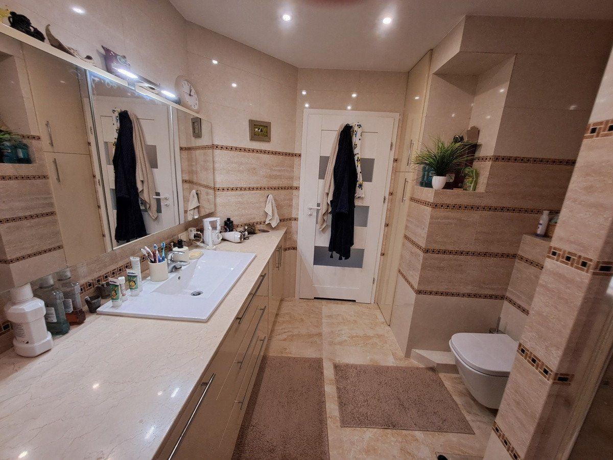 Kuchnia: meble na zamówienie, kamienny blat kuchenny, duża lodówka 205 cm wysokości, w zabudowie piekarnik elektryczny z funkcją kuchenki mikrofalowej, płyta gazowa, ukryty okap z odprowadzeniem do przewodów wentylacyjnych, zmywarka, w zlewie jest młynek do mielenia odpadów (nie trzeba wynosić obierek, ogryzków, itd).