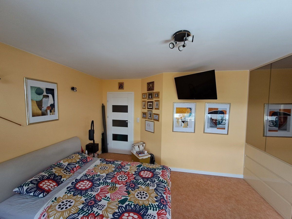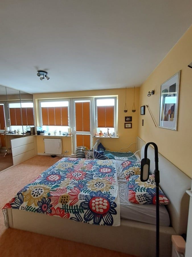 Sypialnia (16,20 m2): wykładzina dywanowa, pod którą są ułożone 2 warstwy płyt z kory dębowej. Szafa wnękowa o szerokości 318 cm i głębokości 61 cm z 6 szufladami. W oknach rolety plisowane. Balkon francuski.